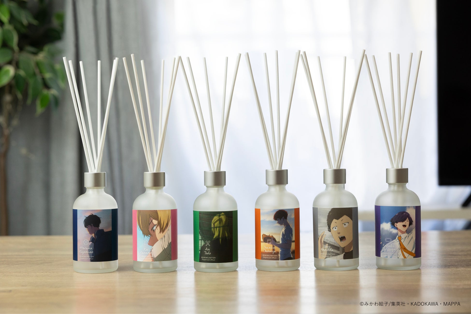 作中に登場するキャラクターのイメージを香りで表現しました。まるで『忘却バッテリー』の世界に入り込んだような、没入感を味わうことができます。またディフューザーのデザインも正面だけでなく、裏側のデザインまで楽しんでいただける仕様となっております。