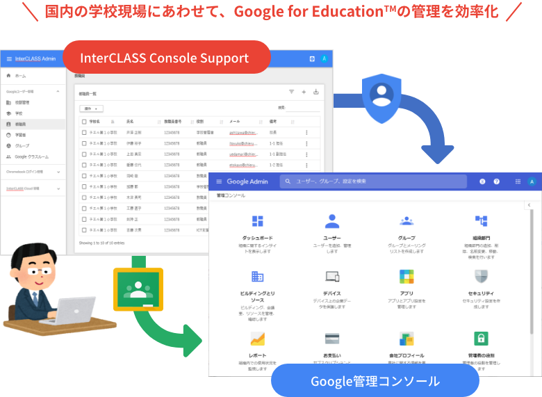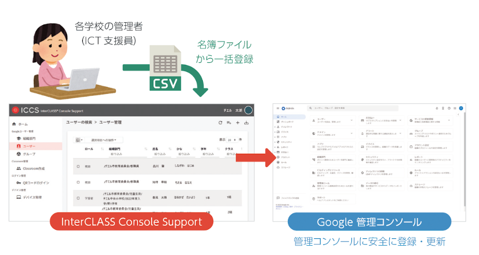 『InterCLASS® Console Support』は、Google 管理コンソールの機能を拡張することができる Google Workspace™︎ に対応したアプリケーションです。Google 管理コンソールと連携して、学校のユーザー・グループの一括管理やデバイス管理、Google Classroom のクラス設定などの作業を簡単かつ速やかに行うことが可能。昨今では学校でのICT環境の利活用が進むにあたり、アカウント管理をはじめとした管理業務も煩雑になりつつあります。こうした状況を踏まえ、教職員の業務負荷をさらに軽減するべく、『InterCLASS® Console Support』に新機能を搭載いたします。