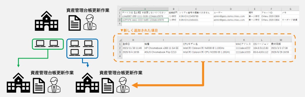 「アセットID」に資産管理番号を、「場所」に学校名を、「メモ」に修理履歴などを記載しておくことで資産管台帳の作成をスムーズに進めることができます。資産管理台帳は学校ごとに作成・管理しているケースが多く、年次更新のタイミングで学校間で端末を移動する際の更新作業の負担を軽減します。