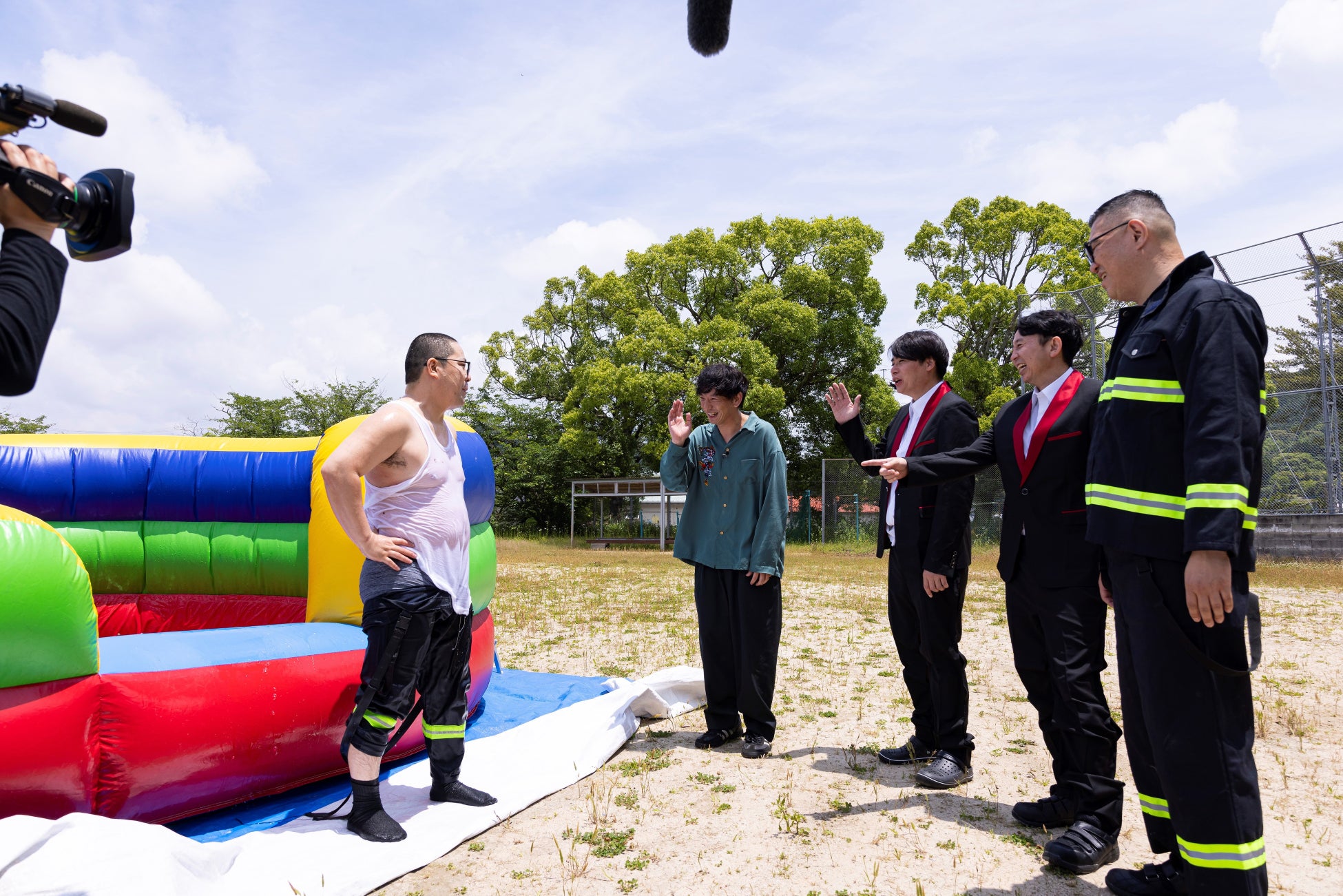 1本目のチャレンジで既に疲労困憊気味の一行を休む間もなく待ち受けるのは「ジャンボスライダー」。高さ15メートルのジャンボスライダーから、まるで垂直落下の角度で落ちる5秒間の間に、スーツから「自身を象徴する姿」に着替えるというチャレンジ企画。