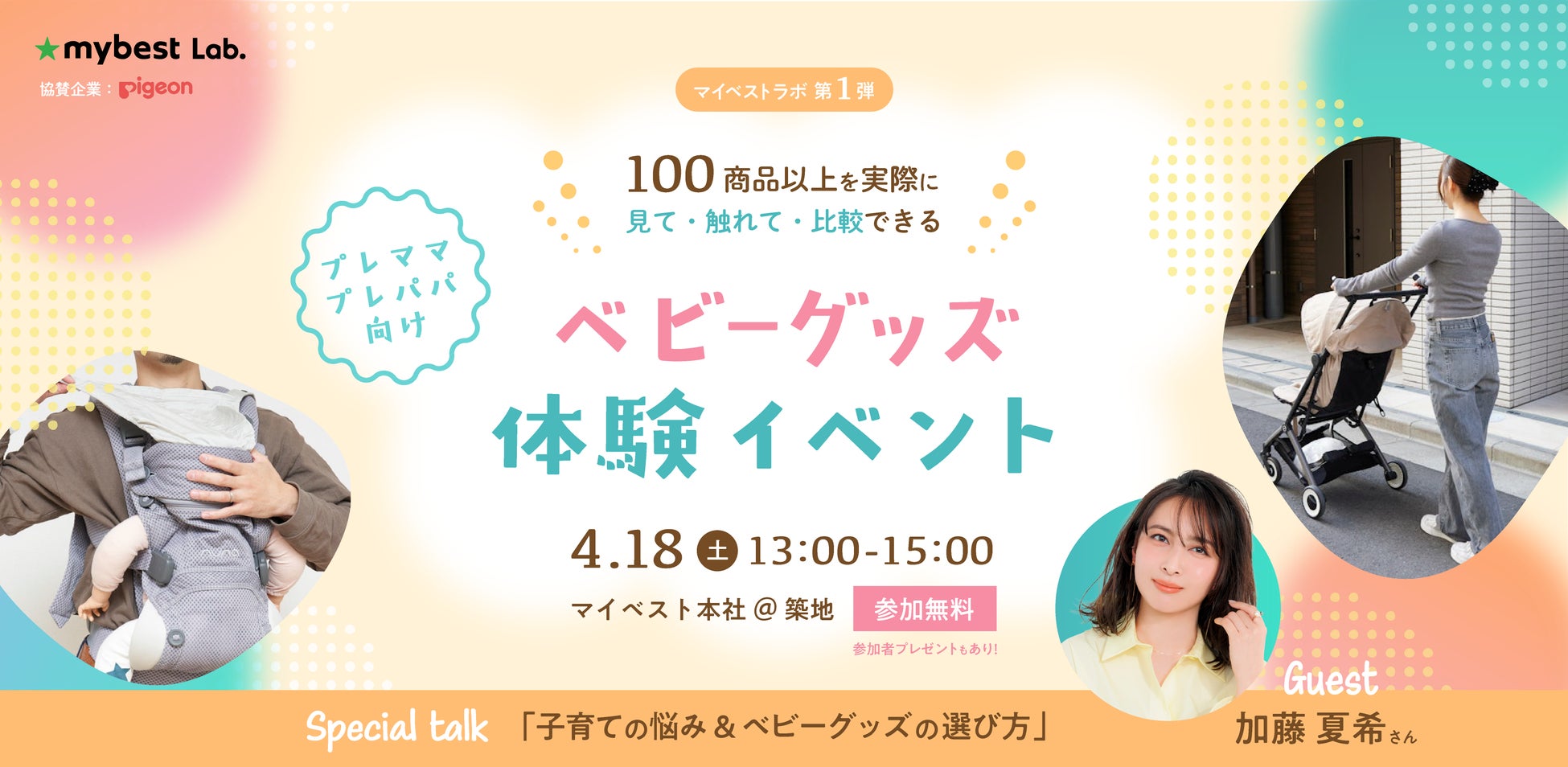 今回の調査結果を受け、ベビーグッズを実際に見て・触れて・比べられる体験型イベントを開催します。当日は加藤夏希さんをゲストとしてお招きし、「マイベストガイド」や「ベビー用品メーカー ピジョンのご担当者様」、「専門家」が選び方のポイントをわかりやすく解説。実際にベビーカーや抱っこ紐など、100商品以上を手に取りながら比較・体験いただけます。選択基準がわからないという不安を、リアルな体験を通じてサポートします。