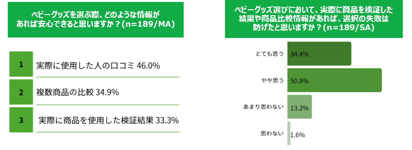 ベビーグッズ選びの際にあると安心する情報として「実使用者の口コミ(46.0%)」に加え、「複数商品の比較(34.9%)」、「検証結果(33.3%)」が上位に。さらに85.2%が「検証・比較情報があれば失敗を防げた」と回答し、比較・検証された情報へのニーズが高まっていることが明らかになりました。