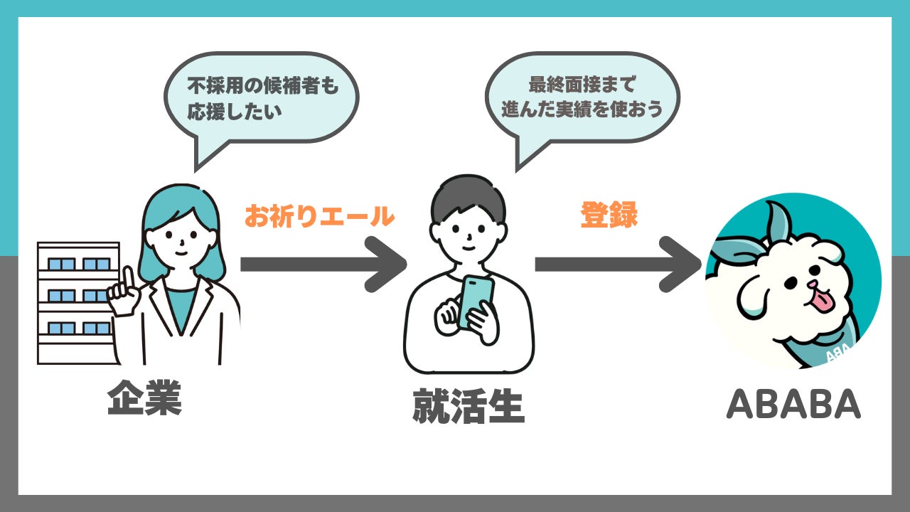 代表の友人が就職活動を通して“うつ状態”に陥ってしまったことを機に創業されたABABAは、そうした状況に置かれている就活生に寄り添おうと、最終面接の不採用通知(通称 お祈りメール)の中で学生への応援メッセージと最終面接まで進んだ実績をもとにスカウトを受け取れる「ABABA」を紹介していただく“お祈り“エール”の取り組みを各企業様と進めています。