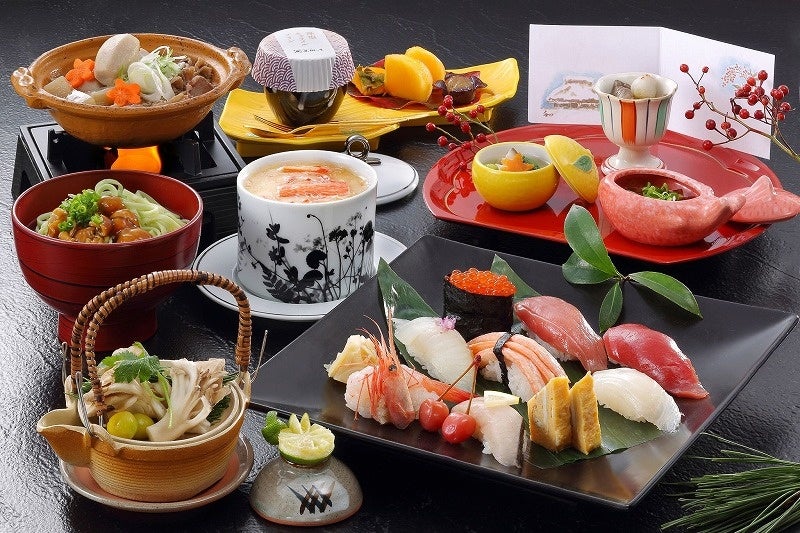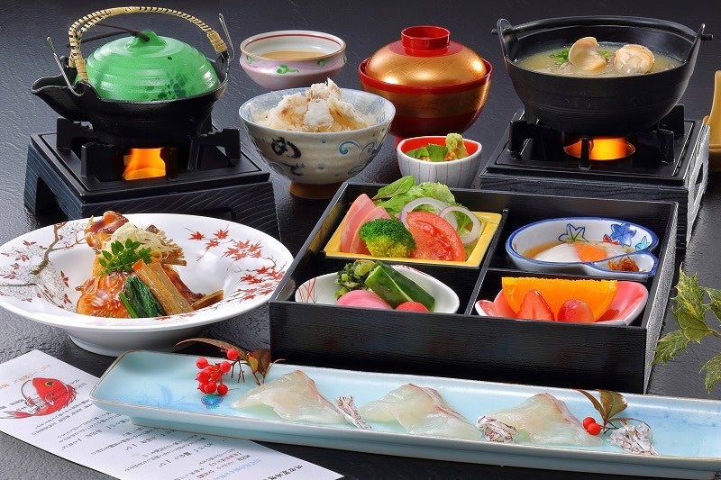 山形・庄内浜産の海の幸をはじめ、旬の食材をふんだんに使用した献立でおもてなし。『山形牛温泉蒸しと活き鮑の踊り焼き食べ比べ会席』や『寿司会席』で“食の理想郷”を味わう特別プラン。