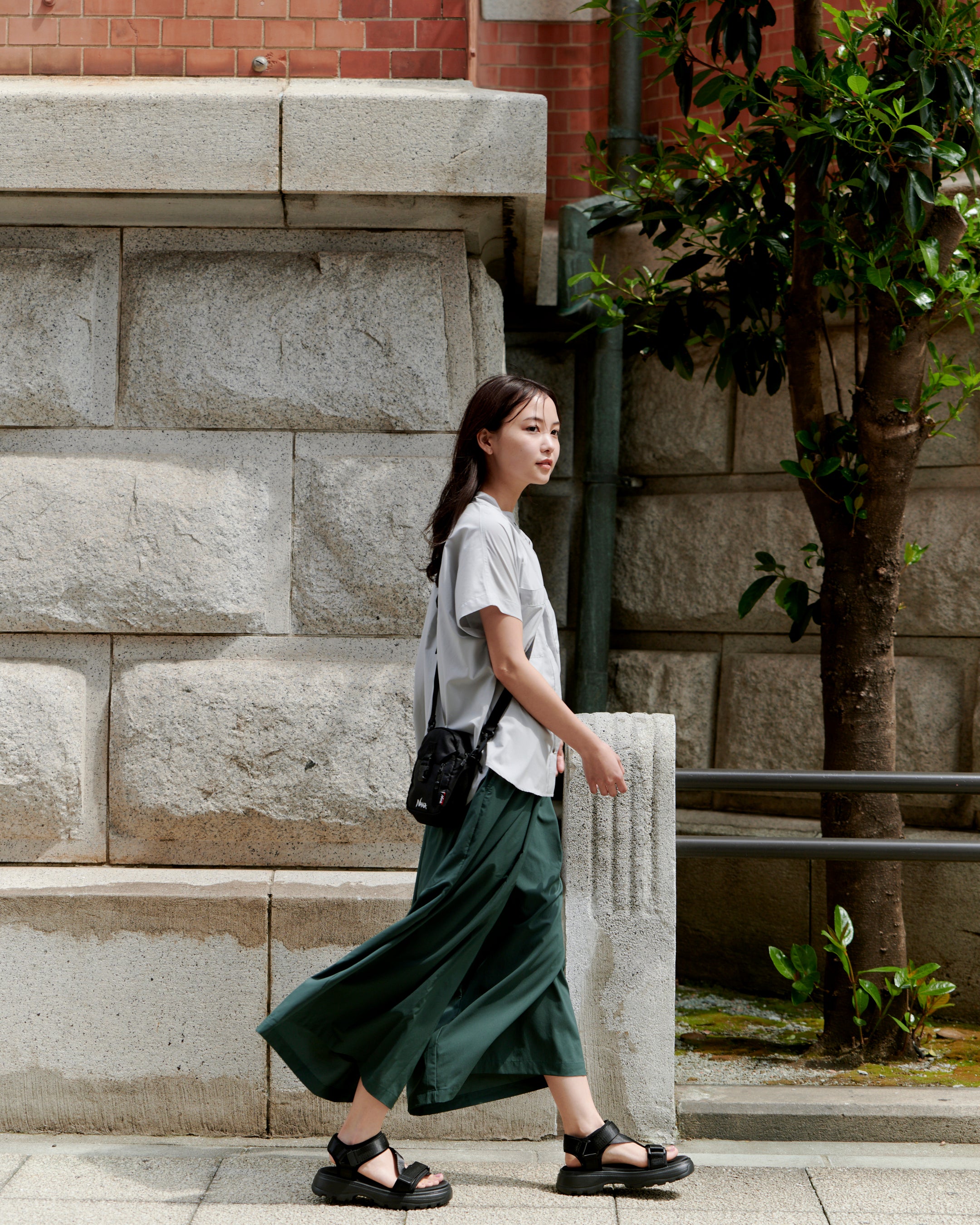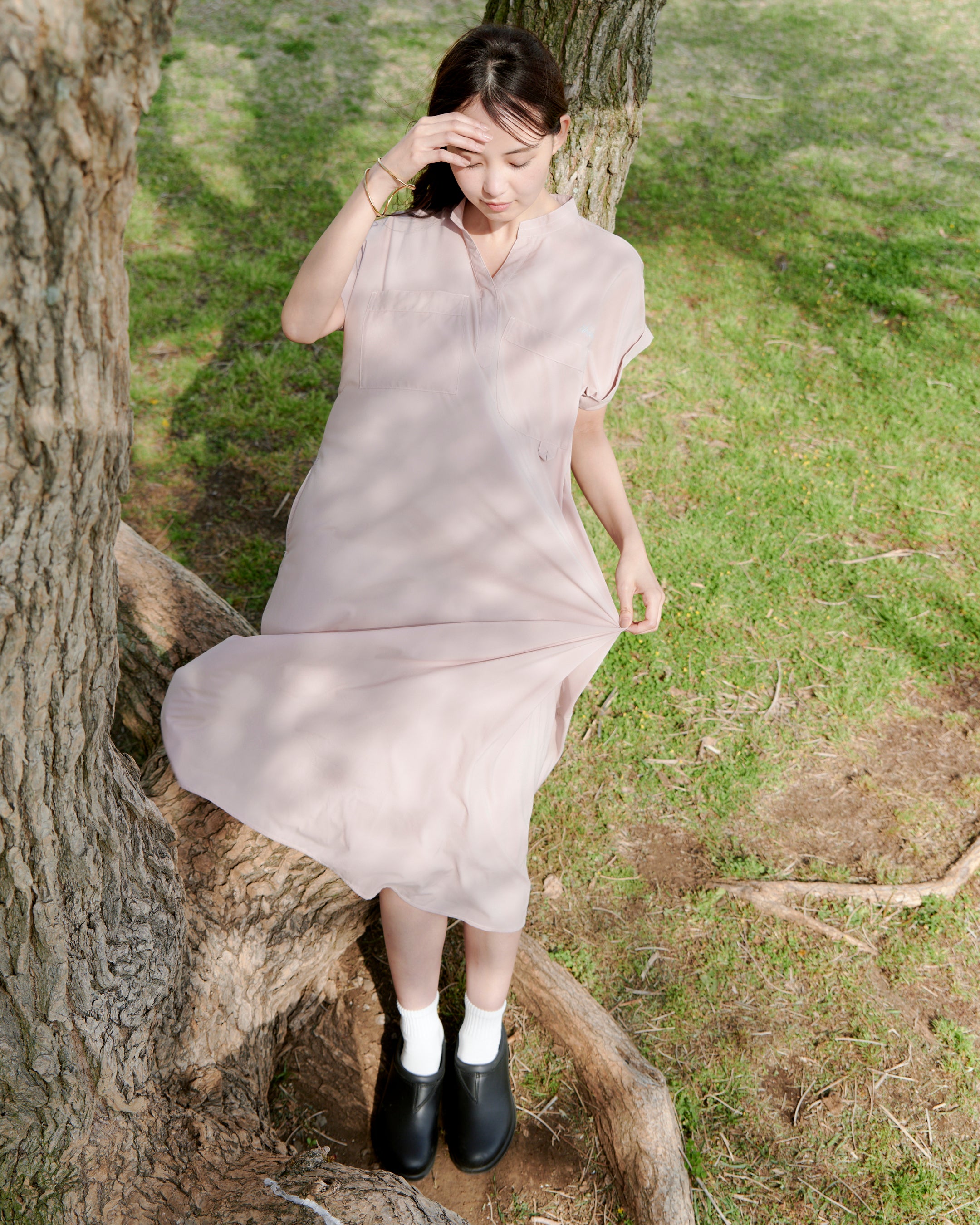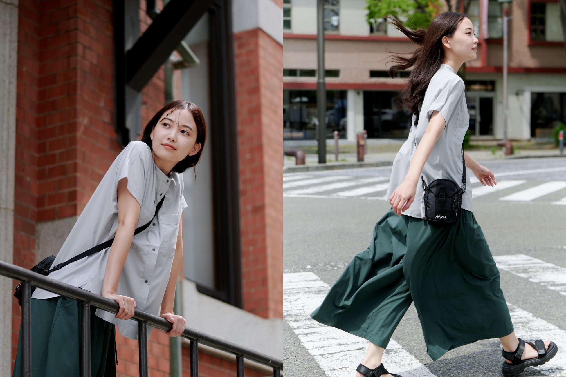 EXCURSIONシリーズでは、SHADOW RIP®の滑らかな表面感に着目し、ワンピースやブラウスなど、ウィメンズアイテムをラインナップ。たっぷりとした用尺で、そのドレープ性と光沢感を活かしたフレアワンピースとワイドパンツは機能素材を使ったウィメンズウェアの新しい提案となっています。