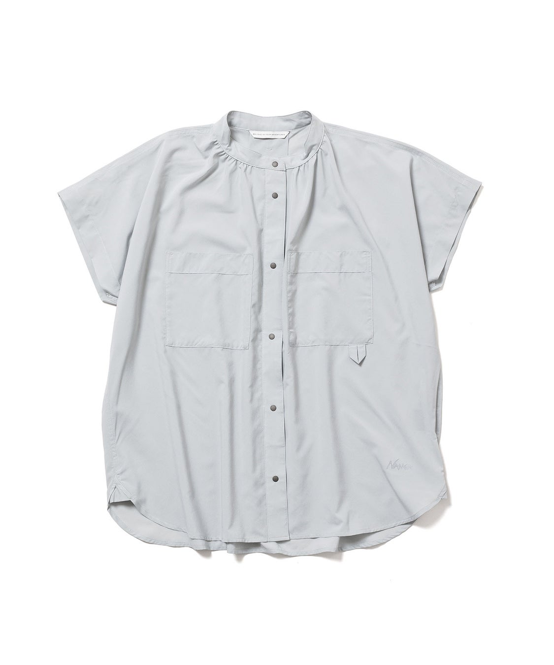 両胸のポケットやループでキャンプシャツの実用性を取り入れながら、ネック周りのギャザーや襟のデザインでフェミニンな印象に仕上げた半袖ブラウスです。ドライタッチでドレープ感の美しいポリエステル生地を採用した、軽く爽やかな着心地を楽しめる一枚です。
