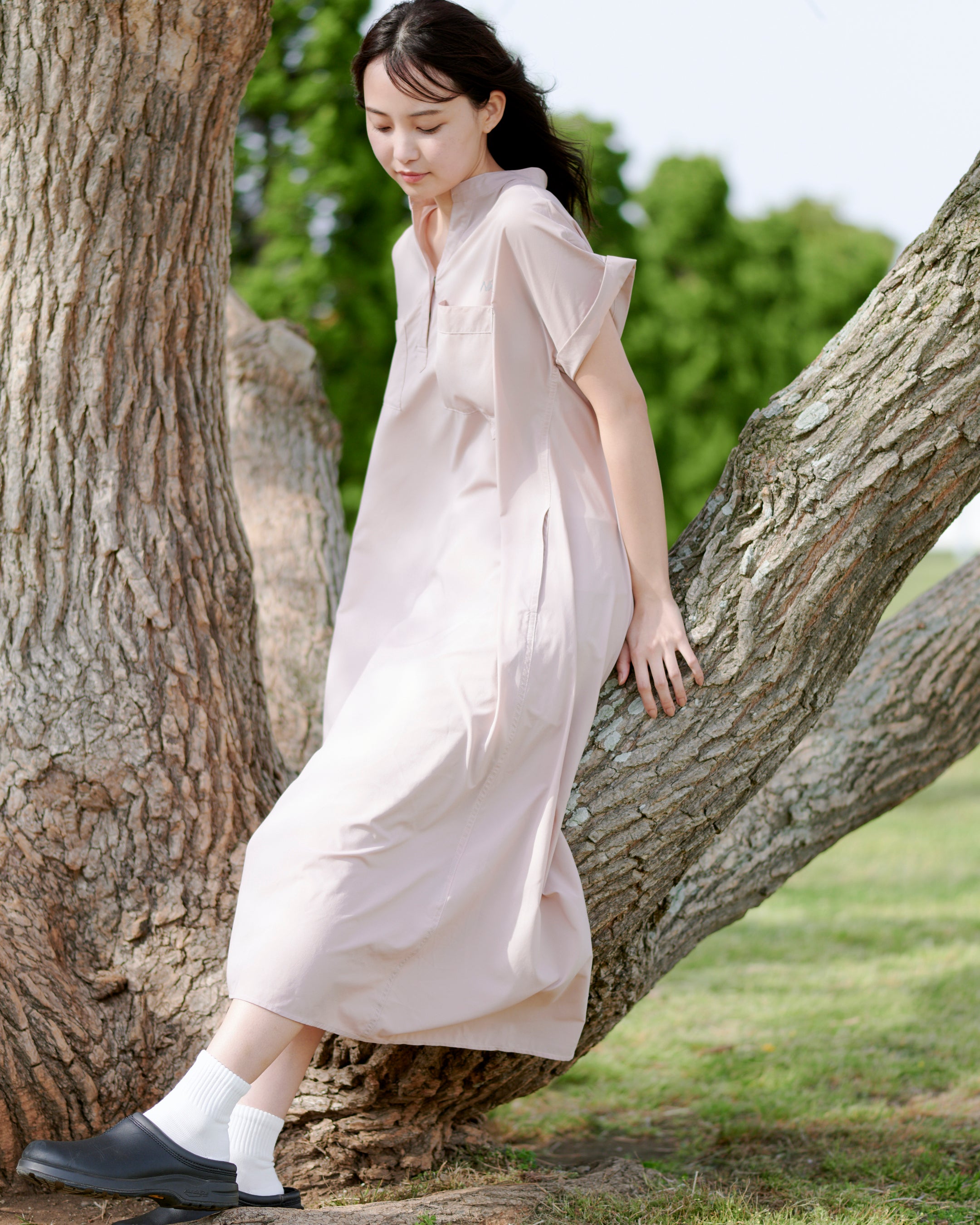 快適さとファッション性を両立させた、小旅行に適したデザインを展開するエクスカーションシリーズ。マキシ丈ワンピースはゆとりのあるAラインのシルエットで、汗をかいても肌にまとわりつきにくいドライタッチな素材を採用。胸と腰にポケットも備えています。