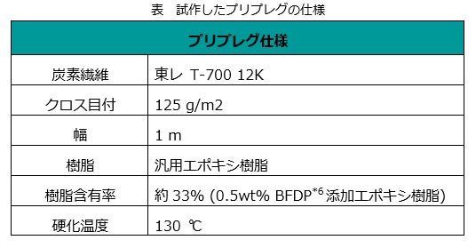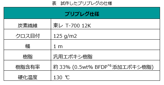 開発したプリプレグの主な仕様を下表に示します。製造にあたっては、まずCNFをエポキシ樹脂に均一分散させたものを準備し、それをプリプレグ製造メーカーでプリプレグ化します。