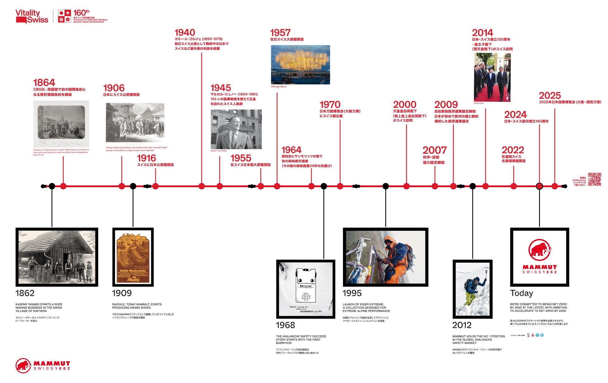 また、同時にマムートの歴史も展示。1862年からロープを製造したことから始まり、世界的にも高いシェアを誇るアバランチビーコンの誕生や、アスリート共に作り上げてきたアパレルの最高峰コレクション「アイガー エクストリームシリーズ(Eiger Extreme Series)」など、現代にいたるまでの歴史が一目でわかるようになっております。世界でも例を見る事のできない、日本とスイスの歴史とマムートの歴史を同時にお楽しみください。