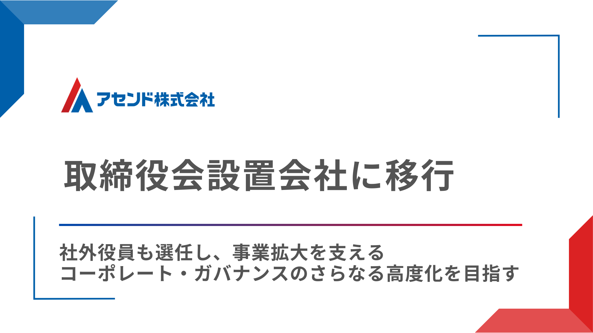 2023年のシリーズA以降、アセンドは株主との間で極めて強度の高い議論を重ね、経営基盤を磨いてきました。2025年のシリーズBを経て、事業ステージの進展に合わせ、ガバナンス体制をより強固なものにすべく取締役会設置会社へと移行します。