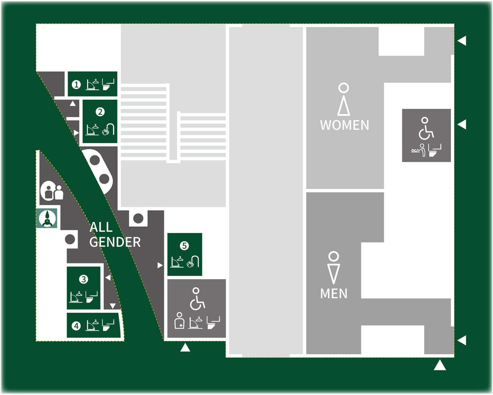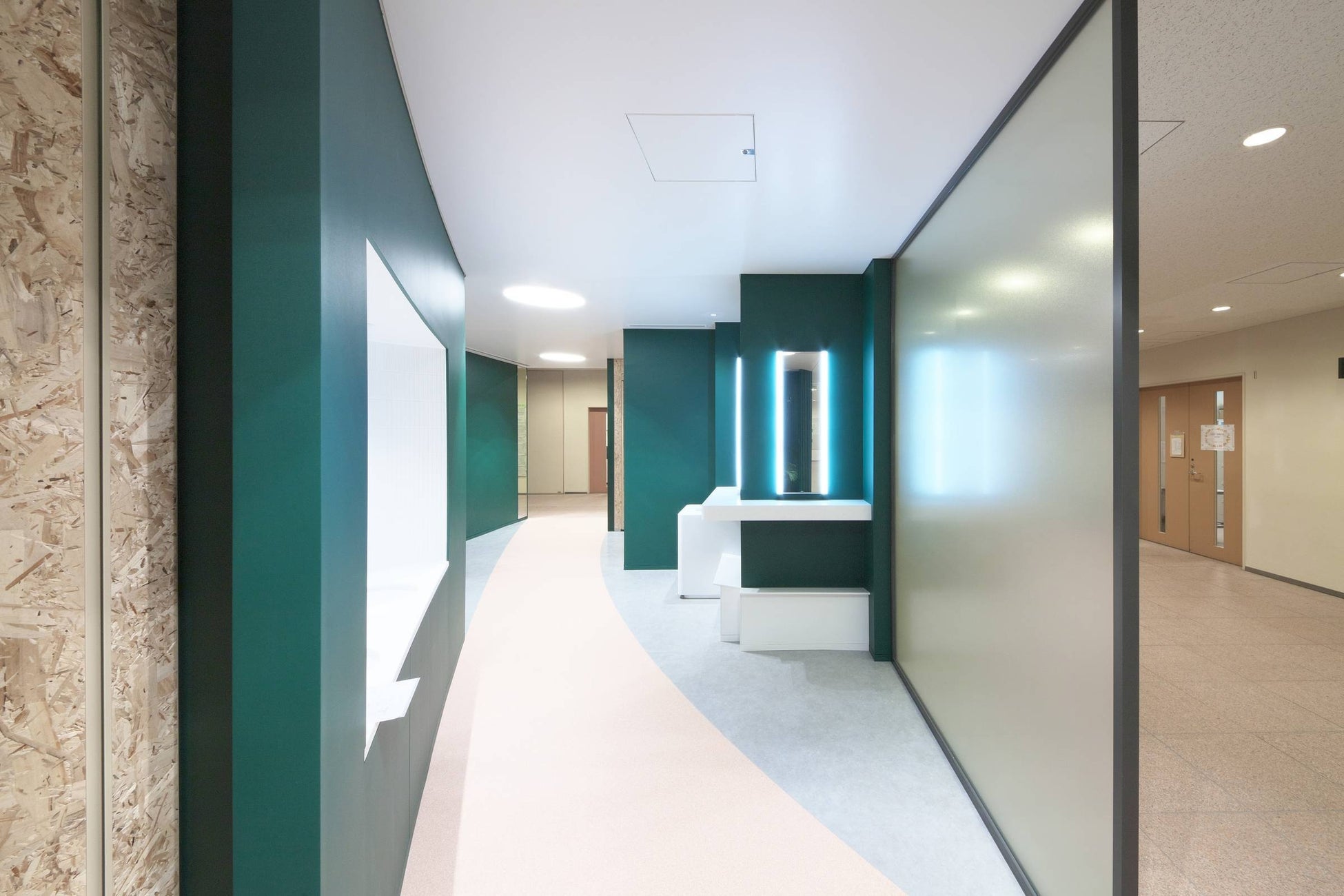 キャンパス中央に位置する百年館の1階トイレをオールジェンダートイレに改修しました。2箇所の出入口をつなぐ曲線を描いた通路を中央に設けつつ、出入りや手洗いの際に利用者同士の見合いが発生しにくく、かつ見通しのよいレイアウトとなっています。オールジェンダーというだけでなくプラスαの機能を持った「これからのトイレ」として捉え、洗面やフィッティングボード、タッチレス(非接触)サニタリーボックスなど、誰もが使いやすい機能を持たせた目的別のブースを複数設けています。