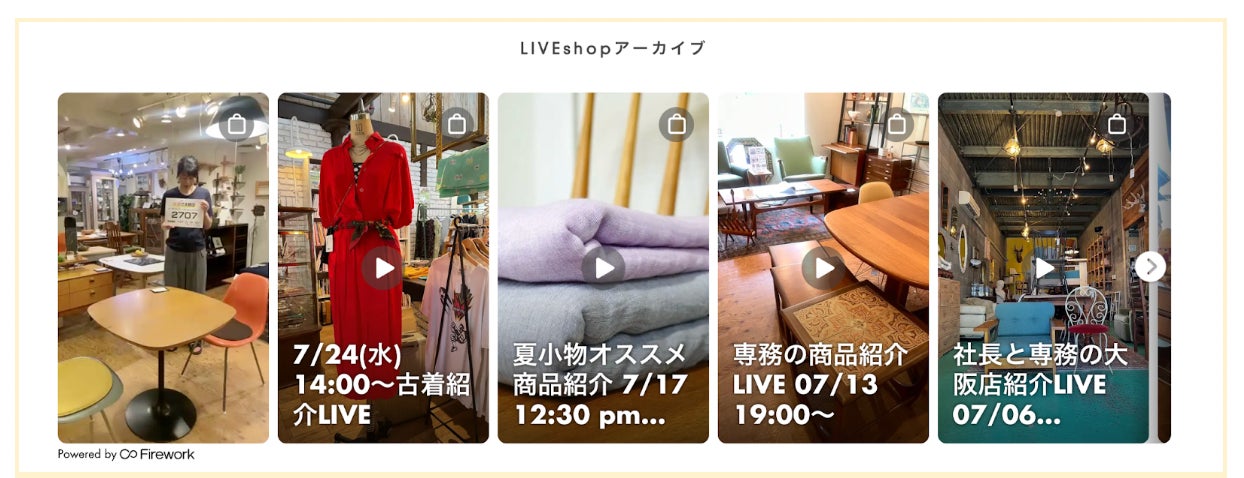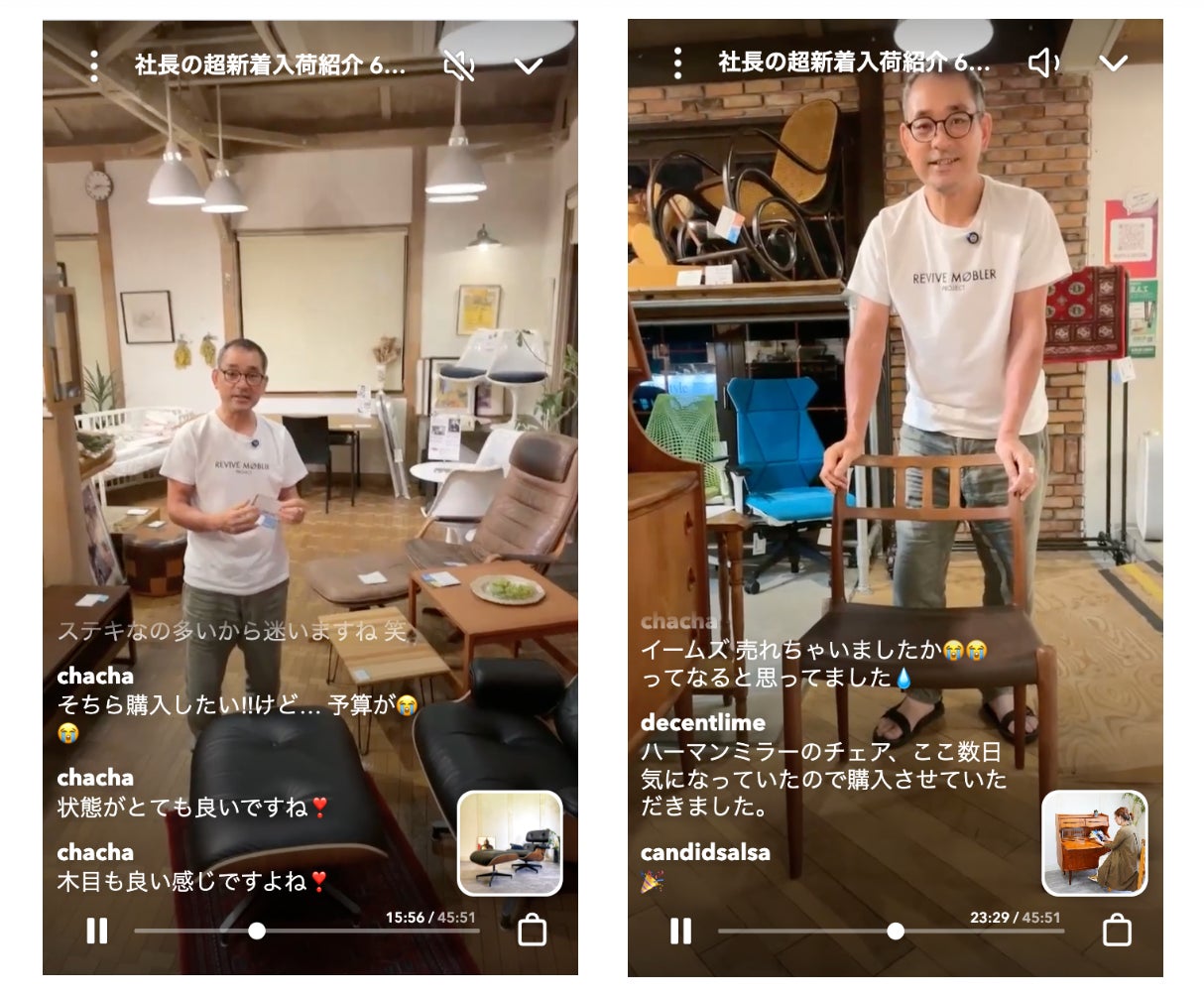 課題:家具やインテリア雑貨、ヴィンテージやアンティークを含む中古品は、ネットショップでのお客様の購入の“ハードル”が高くなります。そのため、ライブコマースを通じて、顧客の疑問や質問にリアルタイムで答えることで、購入を促進したいと考えていました。YouTubeライブやインスタライブを試したこともありましたが、仕様が煩雑で、売上に繋がるライブが展開できずにいました。