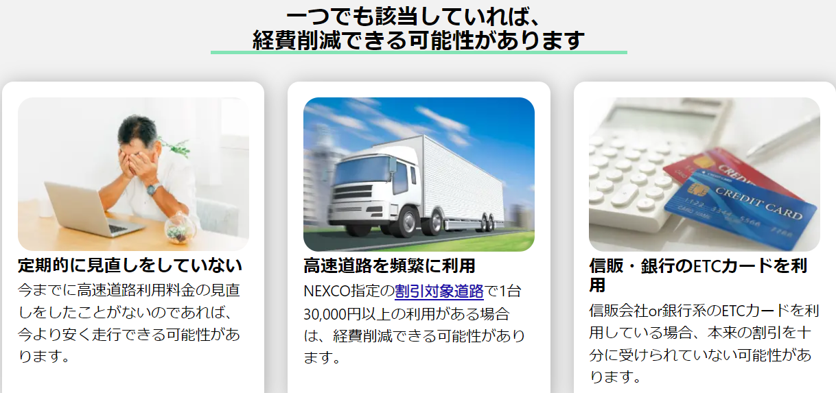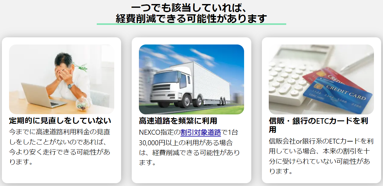 過去のお問い合わせ実績としまして、高速料金も燃料代も見直しを行った結果双方で大きな削減に繋がるといった事もありました。