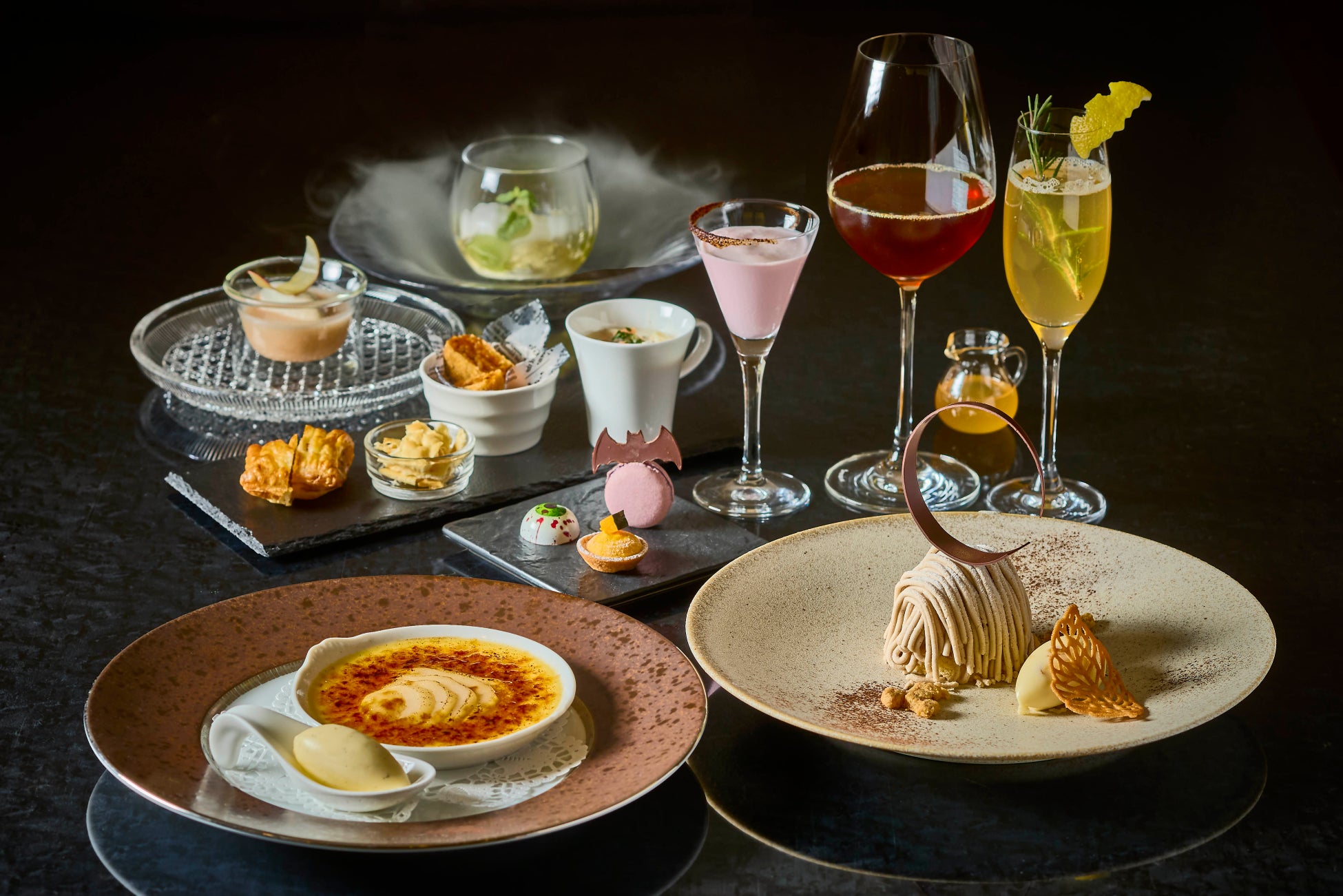 シャインマスカットのクレームダンジュ、紅玉りんごのスープ仕立て、メレンゲとクレームシャンティが入ったモンブランなどのデザートと、パイナップルとローズマリーのウェルカムドリンクやほうじ茶とスパイスのモクテルなどを合わせてお楽しみいただけます。最後にはハロウィン気分が楽しめる小菓子(ミニャルディーズ)もご用意しております。