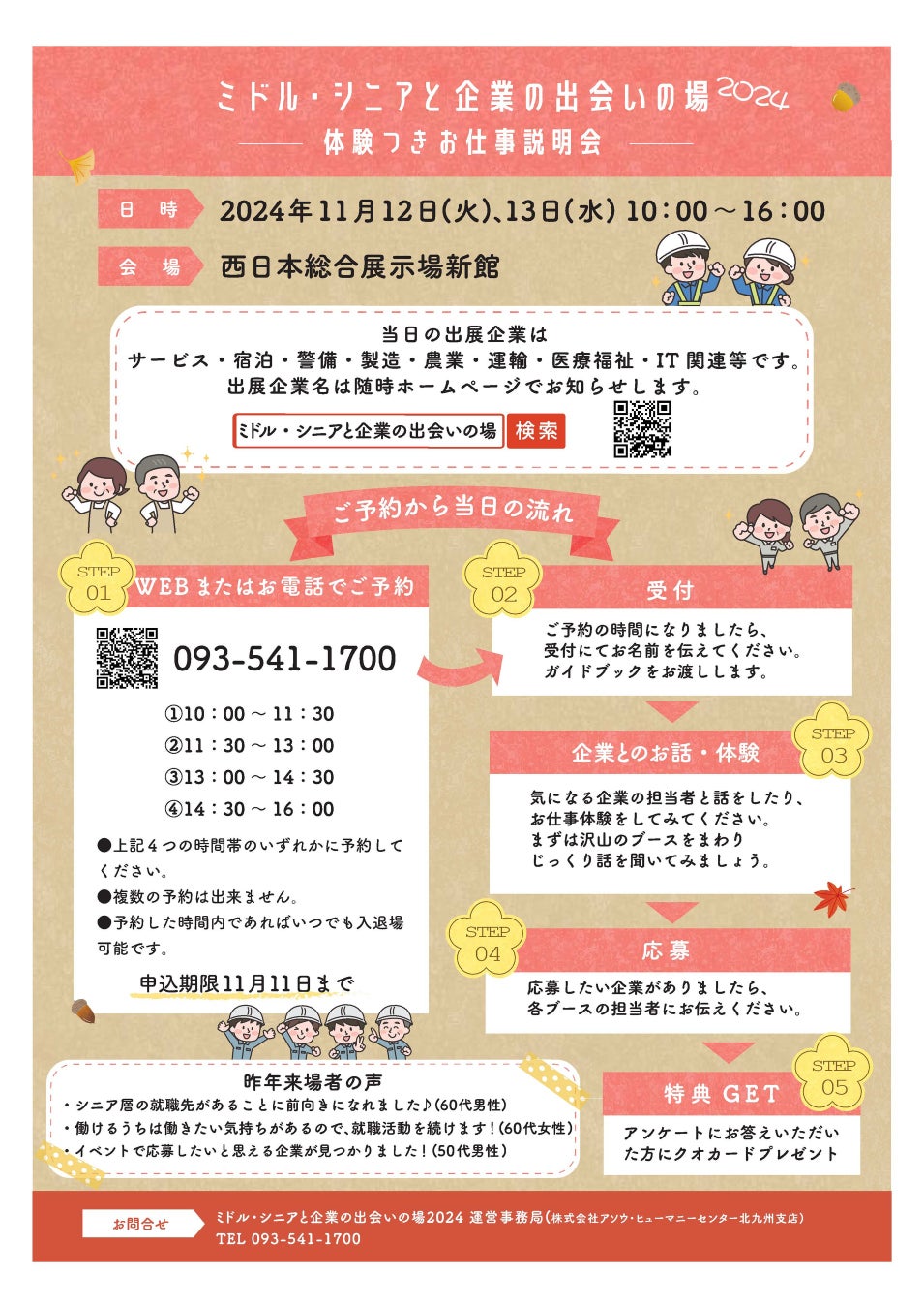 ミドル・シニアと企業の出会いの場2024- 北九州市主催 体験つきお仕事説明会を11月12日、13日に開催します!事前予約は11月11日まで!