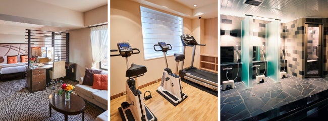 シック&モダンな客室はベッドも浴槽も大きめのゆったりサイズ。宿泊者専用サウナ・大浴場もございます。