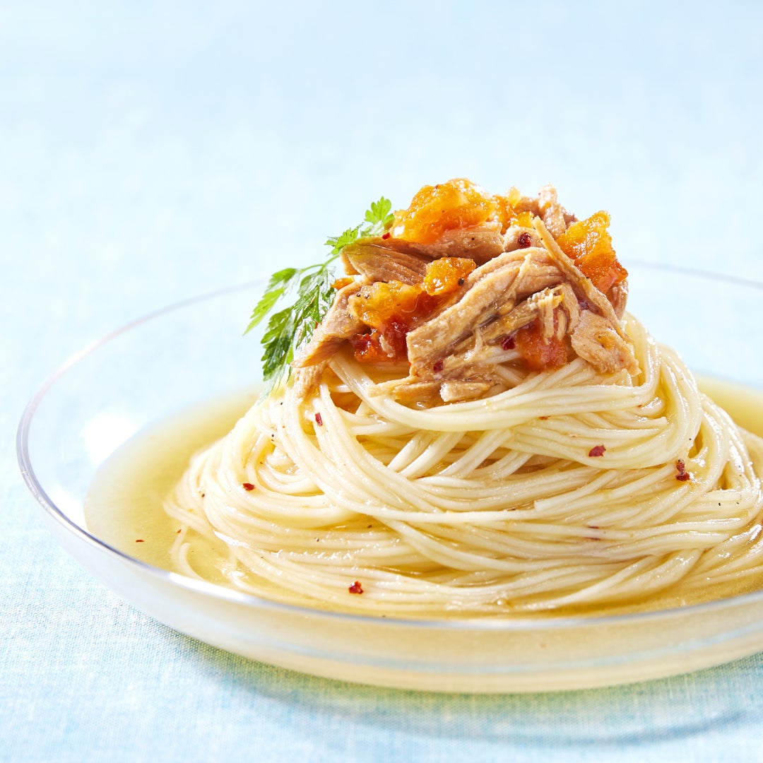 開催期間中、千里阪急公式LINEのお友だち追加とニシキヤキッチンの商品を税込3,000円以上ご購入のお客様へ先着50名様限定で「冷製八丈フルーツレモンのパスタソース」を1パックプレゼントします。冷蔵庫で冷やして、ゆでたパスタにかけるだけでお召し上がりいただける暑い夏にぴったりのさっぱりとした味わいのパスタソースです。