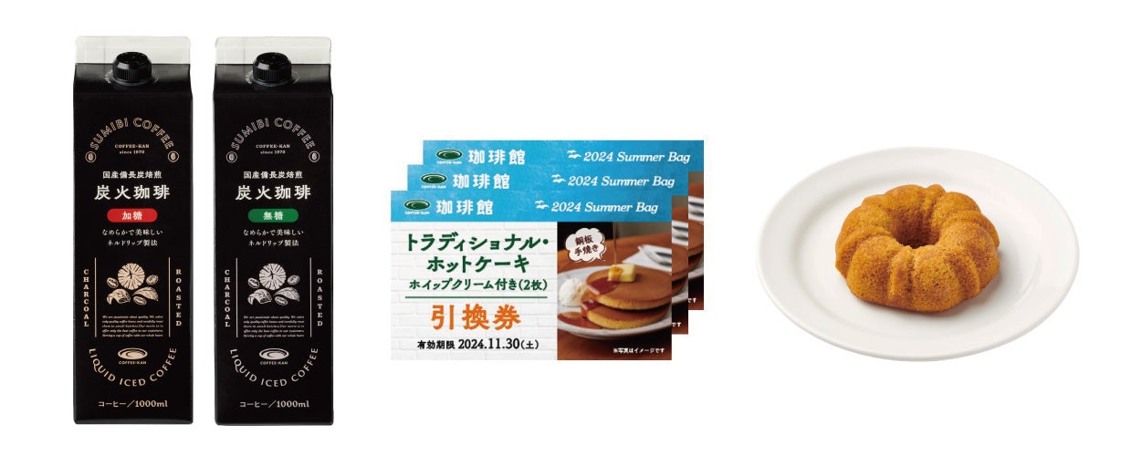 「珈琲館 サマーバッグ2024」は、オリジナルのバッグと扇子、炭火珈琲リキッド2本、トラディショナル・ホットケーキ(2枚)の引換券3枚と人気の焼き菓子が入った数量限定のサマーバッグです。