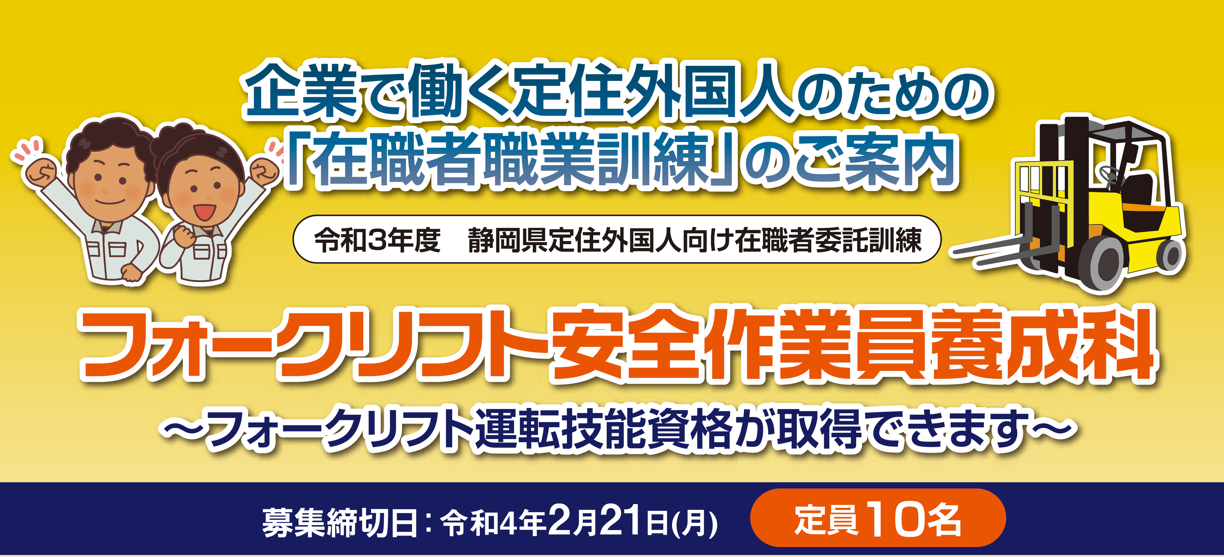 静岡県は、新型コロナウイルス感染症拡大の影響により雇用情勢が不安定な中、外国人の職場定着を支援するため、業務に必要となる日本語能力の向上とスキルアップを目的とした職業訓練を実施します。