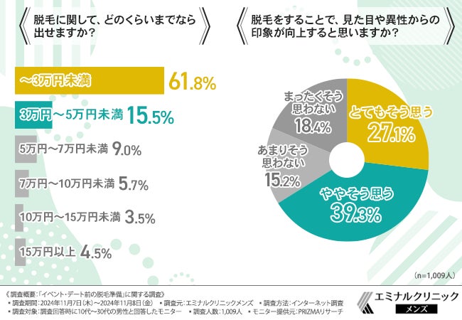 イベントやデート時は、自然な見た目を残しつつ、目立つ部分だけ処理している状態や完全にない状態が理想の方が多く、脱毛によって見た目や異性からの印象向上につながると思う方は6割以上であることも明らかとなりました。