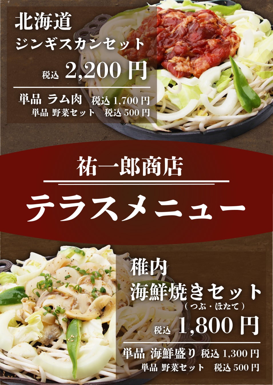 価格 | ジンギスカン 1人前 2,200円、海鮮焼きセット 1人前 1,800円 ※価格は税込 |