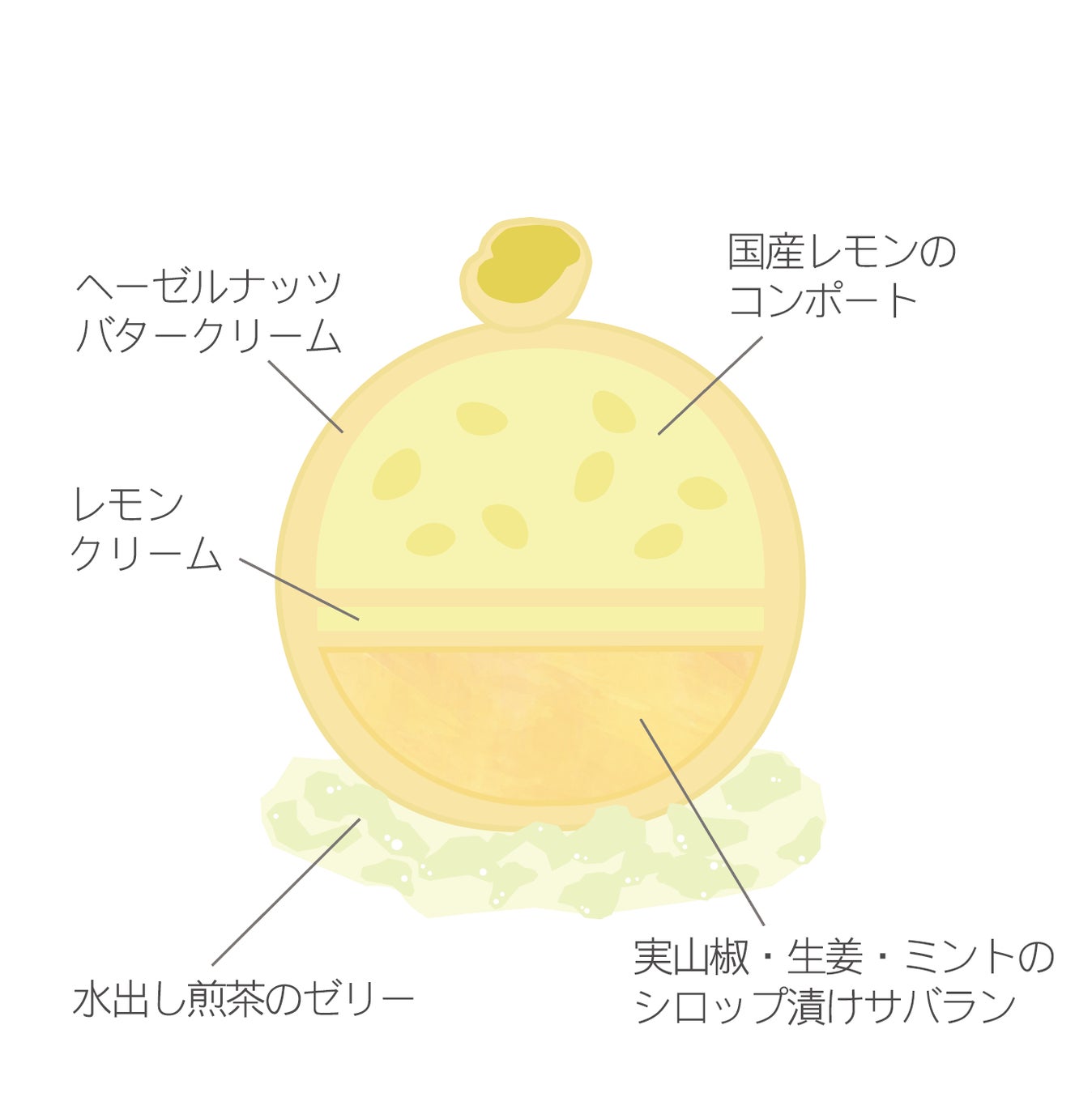今年も夏祭りをイメージした「ふうせん」シリーズの季節が到来しました。2025年の新作「檸檬ふうせん」は、国産レモンを使用したコンポートとレモンクリームを合わせた、爽やかな酸味と香りが特長です。さらに、ミント、生姜、実山椒を組み合わせた清涼感のあるシロップに浸したサバラン生地とともに、ヘーゼルナッツ入りバタークリームで包み込みました。バタークリームにヘーゼルナッツを加えることで、レモンの風味をより一層引き出しています。ひと口頬張ると爽やかな夏が口の中に広がります。幅広い世代の方にお召し上がりいただきたいと考え、同商品にはお酒を使用しておりません。