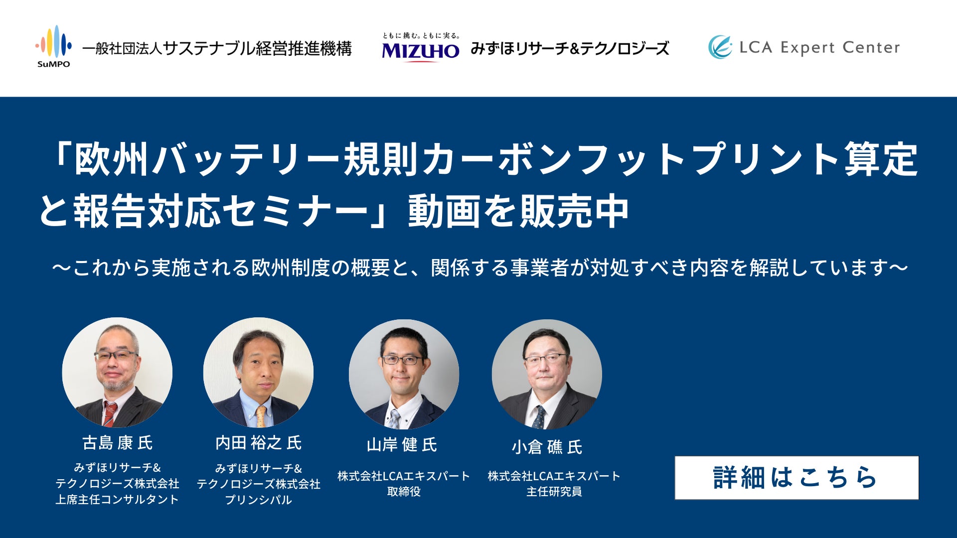 一般社団法人サステナブル経営推進機構(所在地:東京都千代田区、代表理事:壁谷武久、以下、「SuMPO(さんぽ)」)は、みずほリサーチ&テクノロジーズ株式会社および株式会社LCAエキスパートセンターと合同で開催した「欧州バッテリー規則におけるカーボンフットプリント算定と報告対応」セミナーの動画販売を開始いたしました。