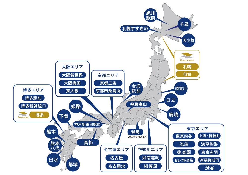 当社では、「ホテルウィングインターナショナル」、「ホテルウィングインターナショナルプレミアム」、「ホテルウィングインターナショナルセレクト」「テンザホテル」の4ブランドを展開し、現在40店舗/5,294室を運営しています。(2023年7月19日時点)