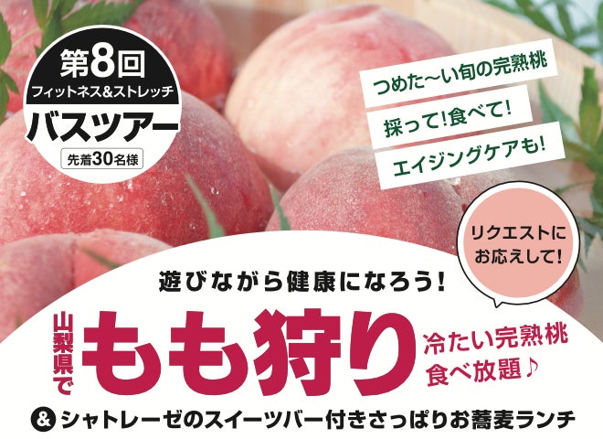 株式会社いーふらん(本社:神奈川県横浜市、代表取締役社長 鹿村大志、以下いーふらん)は、いーふらんが展開するフィットネス&ストレッチ 健康の森事業において、運動を通じた健康促進のみではなく、体験を通じたこころの充足、人と人とのつながりを「遊びながら」創出する会員限定バスツアーにおいて、7月は「山梨県で桃狩り&シャトレーゼのスイーツバー付きさっぱりお蕎麦ランチツアー」の開催を実施することをお知らせいたします。