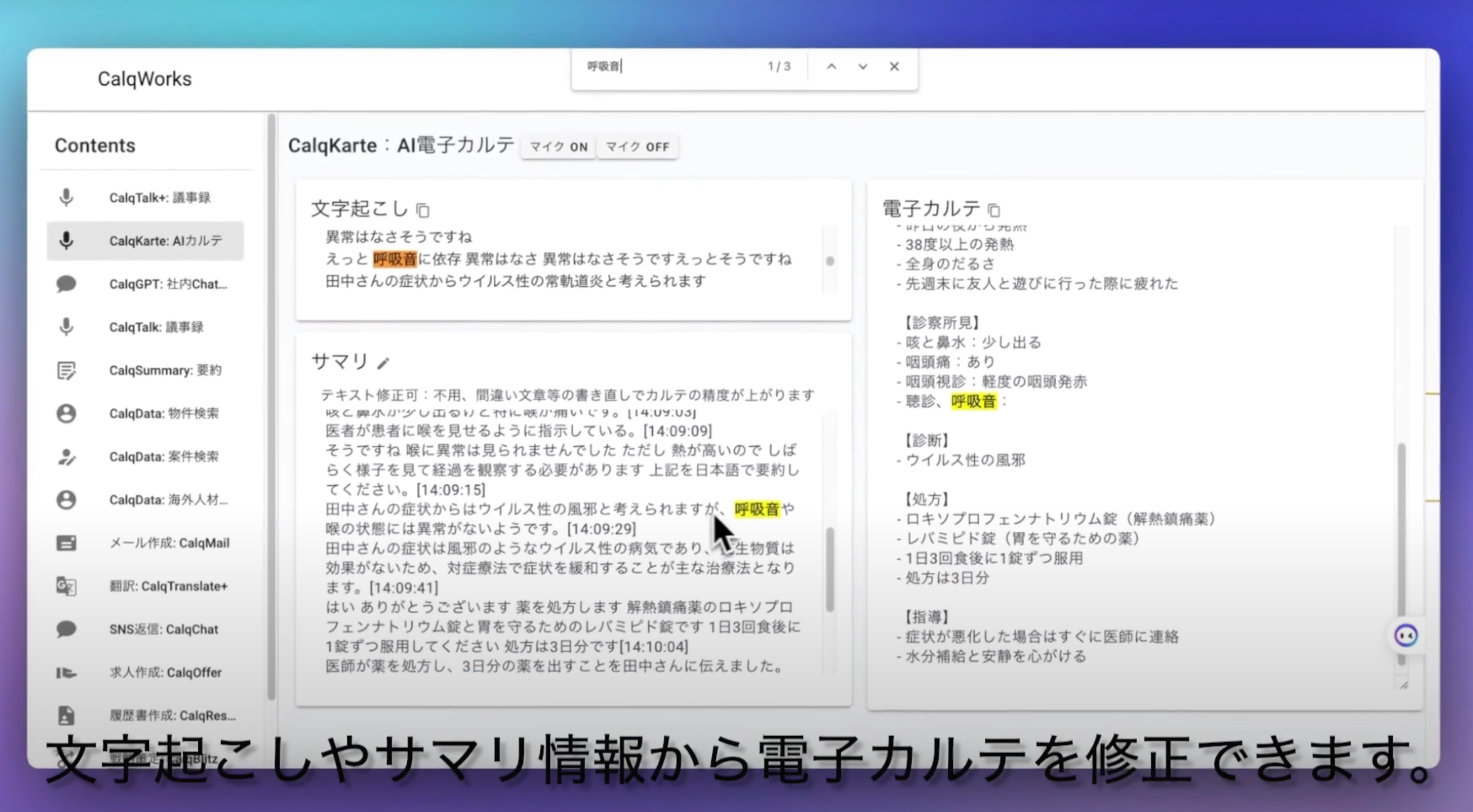 「CalqKarte」は、GPT-4と電子カルテを組み合わせた、リアルタイム議事録作成サービスです。診療中の医師の発言を音声認識技術を用いてテキスト化し、GPT-4がそれをもとに議事録を自動作成します。このように、リアルタイムで議事録が作成されることで、医師は診療に専念でき、診療後のカルテ記載の手間も軽減されます。