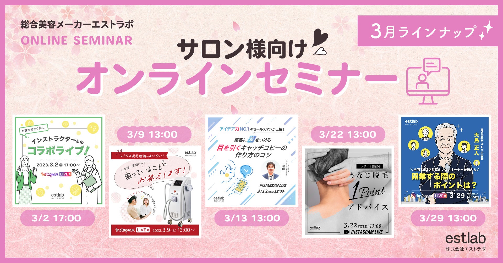 すべての人に「美」と「健康」の提供を目指し、化粧品や美容機器を製造・販売する株式会社エストラボ(本社:東京都新宿区、代表取締役社長:久保瞳)は、定期開催しているエステサロン様向けの無料オンラインセミナーに関して、2023年3月の開催情報を公開いたしましたので、ご案内申し上げます。