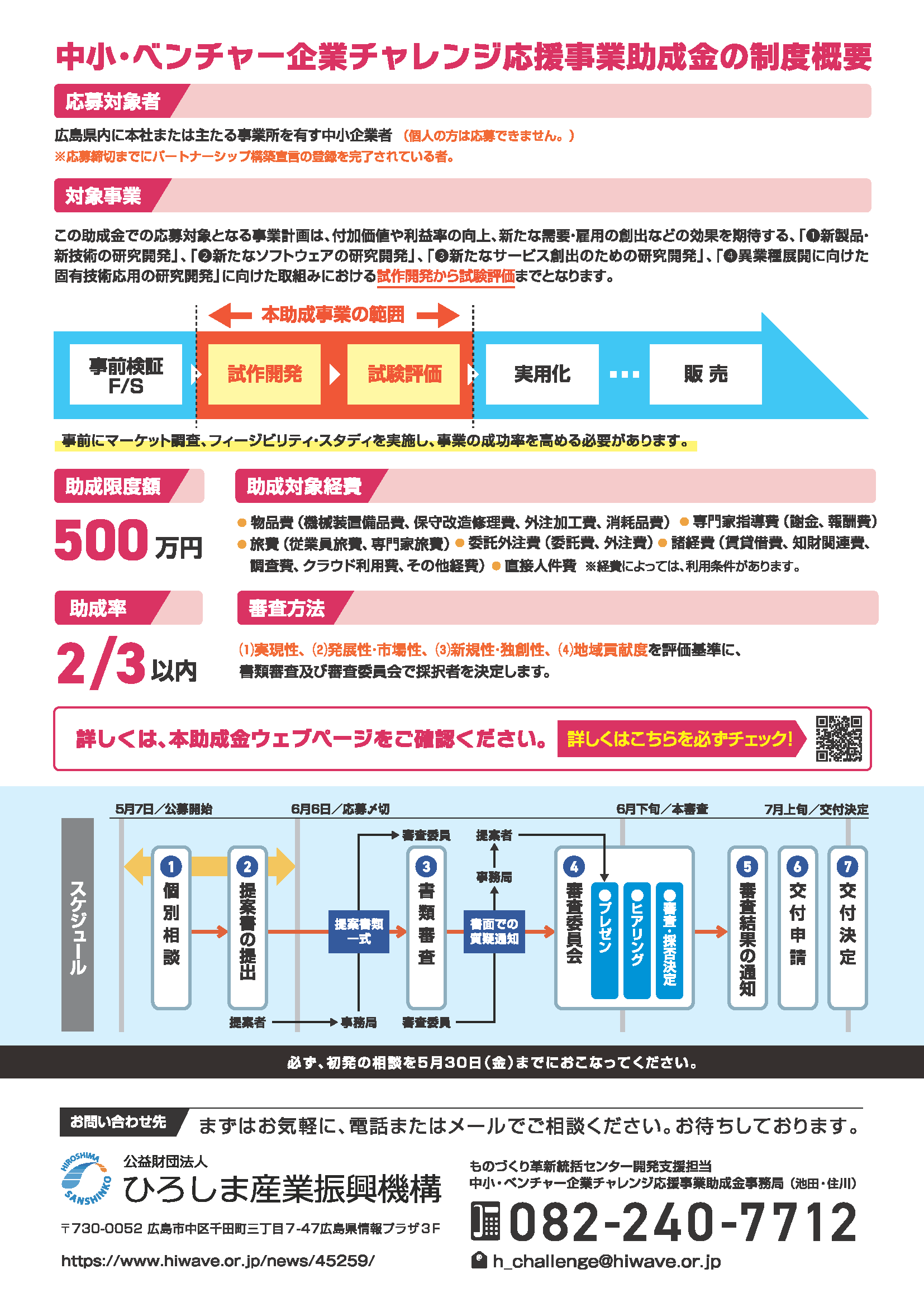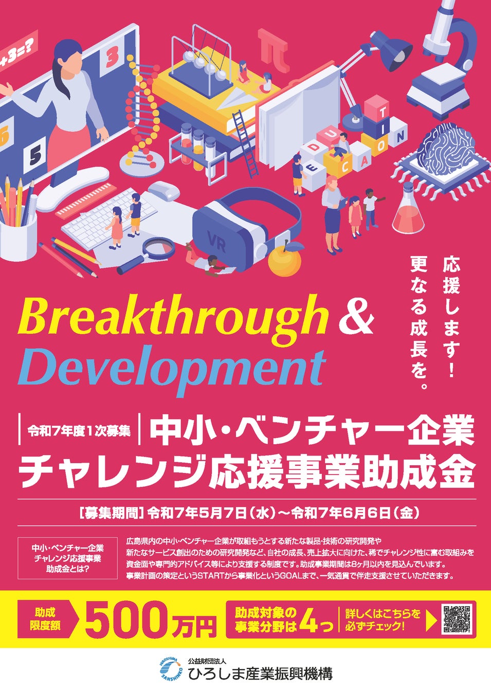 公益財団法人ひろしま産業振興機構では、広島県内の中小・ベンチャー企業が新たな製品・技術の研究開発や新たなサービス創出に取り組むための研究開発など、自社の成長、売上拡大に向けた、稀でチャレンジ性に富む取組みを資金面や専門的アドバイス等により支援いたします。