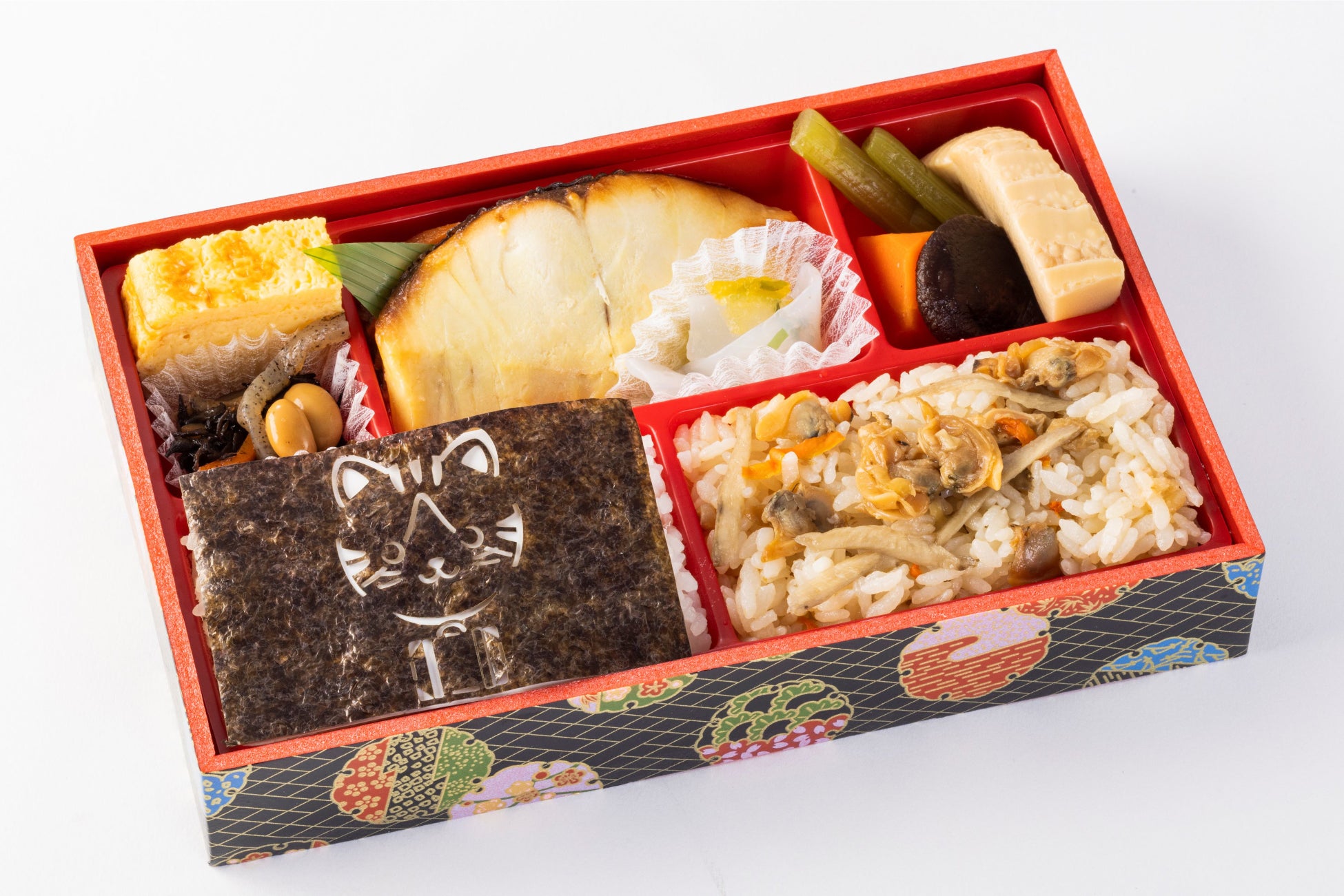 人気の「西京焼と二色ごはん弁当」に、お店オリジナルのにゃらん海苔入り。食べるのを迷ってしまいそうなニコニコにゃらんと一緒に、おでかけが楽しくなる、見た目も味も大満足のお弁当。