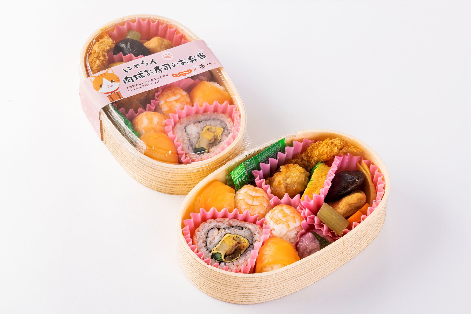 手まり寿司やピンクの大豆シートで仕上げた巻寿司でにゃらんのぷにぷに肉球を表現。揚げ物や煮物、甘味も盛り込んで、春の行楽にもぴったりのお弁当。ネットでエキナカ対応(受取場所:受取カウンター)