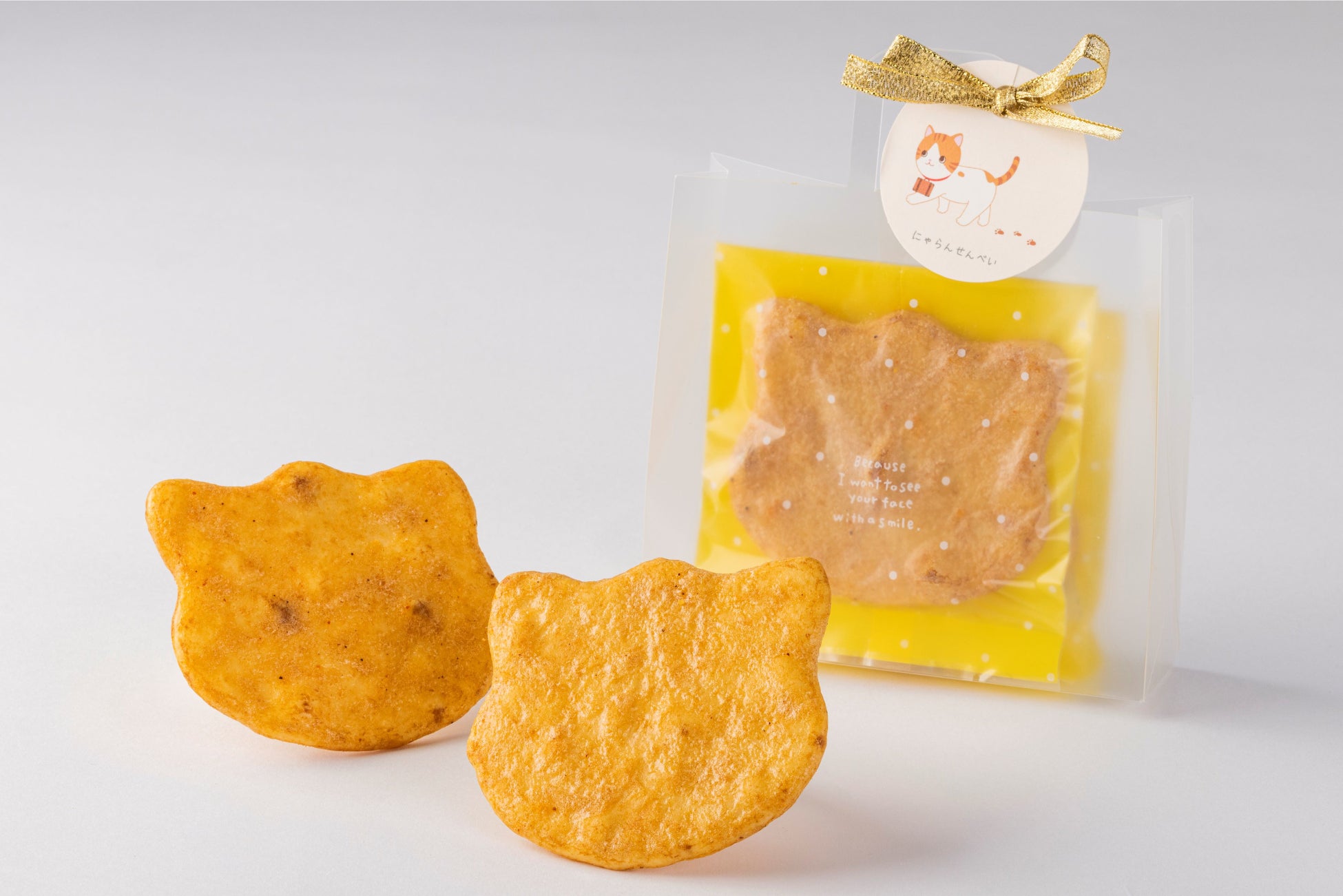 厳選された素材を使用し、ひとつひとつ丁寧に仕上げた職人手作りのせんべい。にゃらんを模ったフォルムが手作りならではのかわいらしさに。パリッと食感もたまらないツナマヨ味。