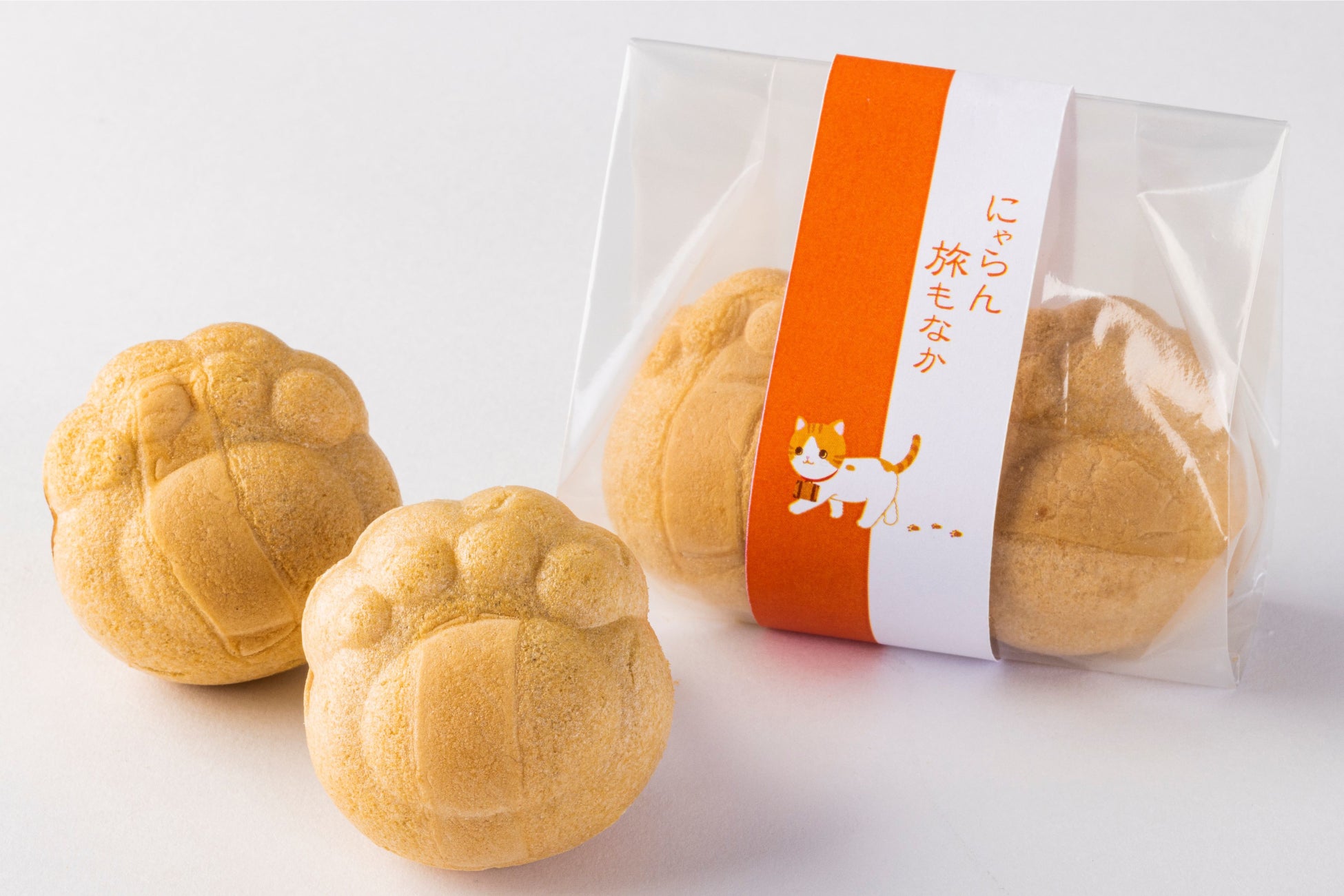 ぷにぷにした弾力が感じられそうなかわいらしいにゃらんの肉球型最中。コロンとしたフォルムの最中はチョコ餡と求肥もち入りで、日本茶にもコーヒーにも合う和スイーツ。※各日限定50個