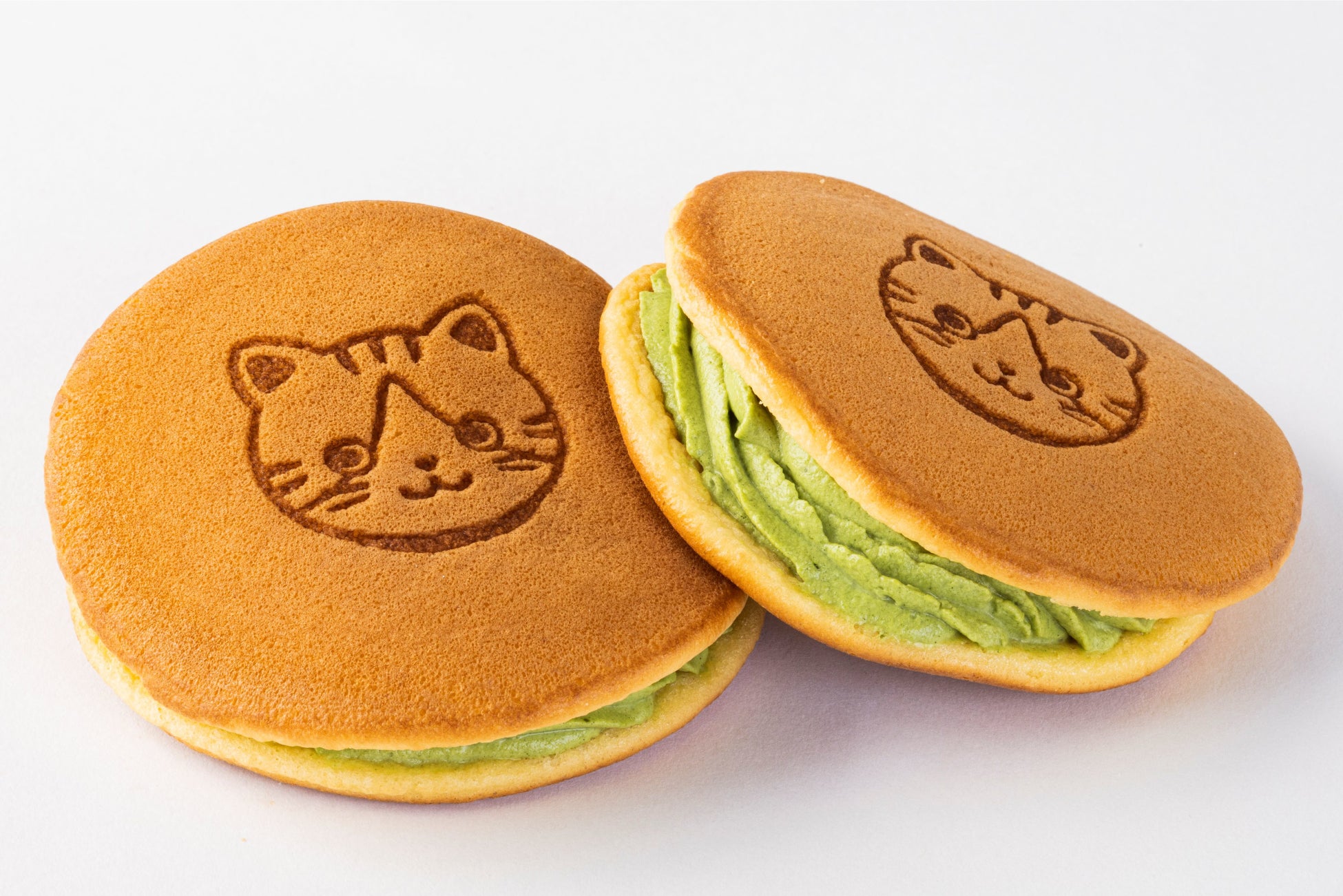 真ん中の粒あんを宇治抹茶を使用したホイップクリームでぐるりと囲み、ふわふわしっとりのパンケーキ生地でサンドしたパンケーキ。生地には、にゃらんの焼き印がにっこり笑顔でご挨拶。