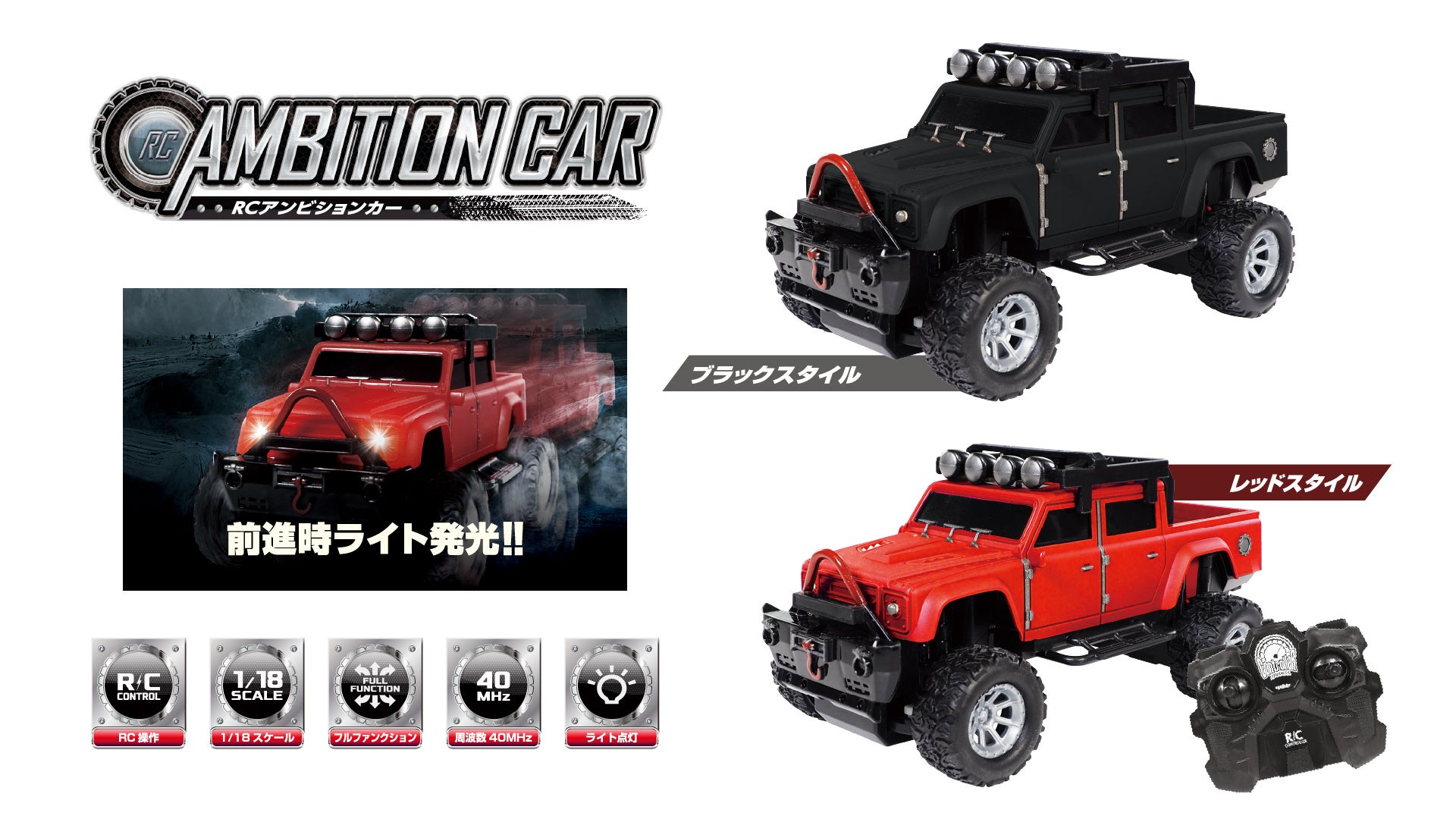 特徴:1/18スケールのフルファンクションカー。前進時のライト発光が無骨なかっこよさを更に引き出します。走る楽しさを追求せよ!専用の送信機付き。レッドとブラックの2スタイル。