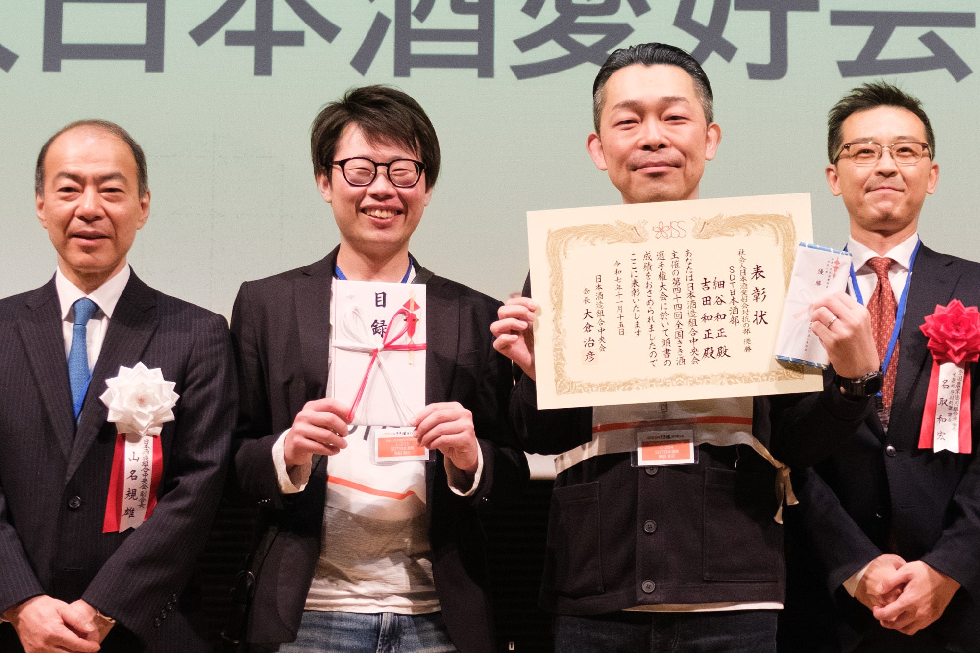 そして、前回大会から新設された「社会人日本酒愛好会対抗の部」(12チーム24名)では、 SDT日本酒部の吉田 和正(よしだ かずまさ)さんと細谷 和正(ほそや かずまさ)さんのペアが優勝。「今年日本酒部を創設したばかり、まさか優勝できるとは。本当に驚いた」と喜びを分かち合っていました。