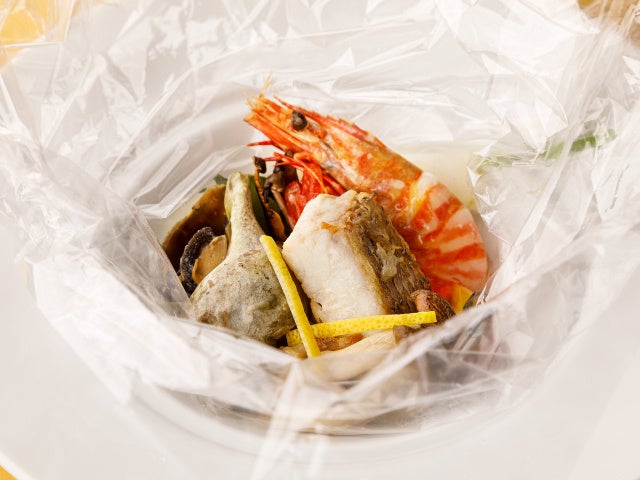 ・鮮魚と魚介、秋のきのこのカルタファータ包み 黄柚子のアクセント