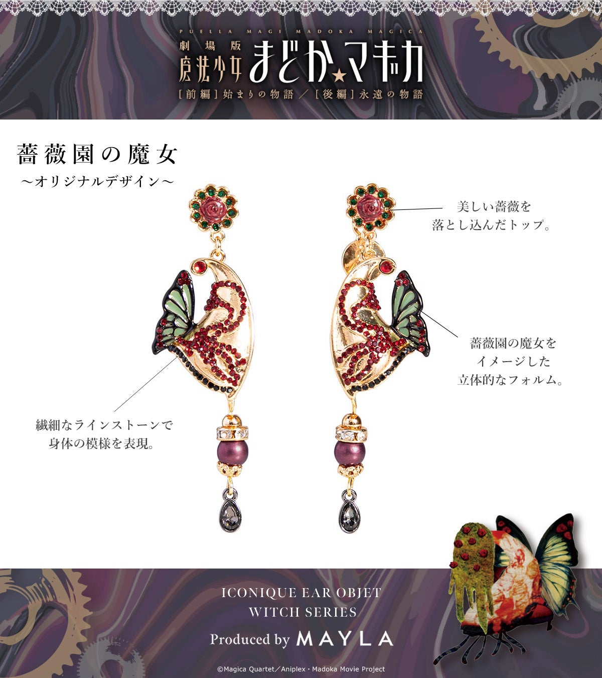 作中に出現する魔女をイメージしたデザインと、グリーフシードをモチーフにしたラグジュアリーなイヤアクセサリー。