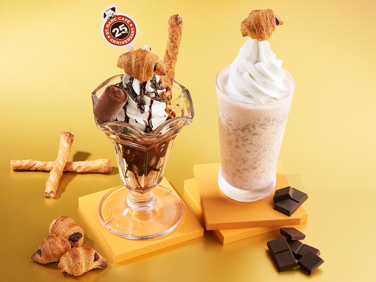 見た目、味わい、食感全てでチョコクロを存分に感じていただけるパフェ。チョコクロの濃厚なチョコレートの味わいを、生チョコアイスやチョコソースで表現し、クロワッサン生地のサクサク食感や香ばしさを、ソフトクリームに店舗で丁寧に焼き上げた自家製デニッシュスティックをトッピングすることで表現しています。また、それぞれの素材を混ぜ合わせることでソフトクリームとチョコクロを同時に食べているかのような味わいをお楽しみいただけます。パフェのトップには、美味しさはそのままに小ぶりになった「ミニミニチョコクロ」がトッピングされているほか、サンマルクカフェオリジナルキャラクターの犬の「チョコクロ」をモチーフにした25周年記念ロゴのピックがあしらわれており、見た目も可愛らしいチョコクロ尽くしのパフェです。