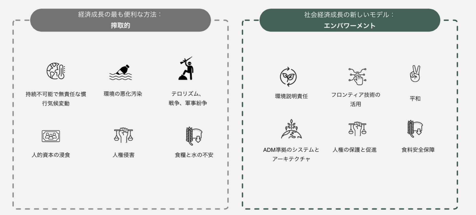 また本フォーラム開催にあたっては、自主発展モデル(Alternative Development Model)の考え方がベースとなっています。このモデルは、従来の限られた資源を基にした搾取型モデルからの転換を図り、持続可能な発展を促進するものです。
