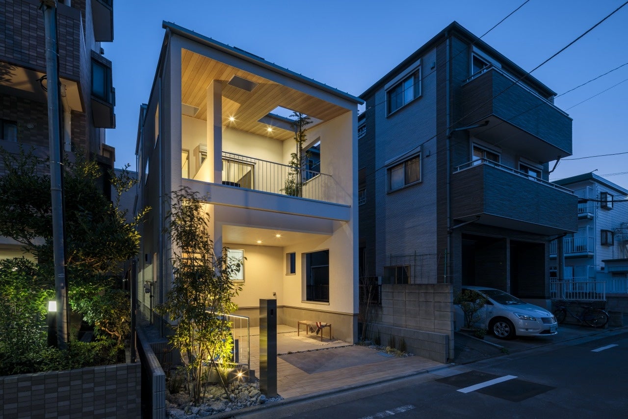 外部から直接アクセス可能なバルコニーのある戸建住宅です。道路に面したバルコニーが昔の日本の住宅における縁側のような役割を担います。道路面と程よい距離感を保ちつつも家の生活が街に漏れ出て、街と家の境界を曖昧にします。街とつながる事で、職住一体の生活など、バルコニー空間を活用したライフスタイルの幅が広がる住宅です。