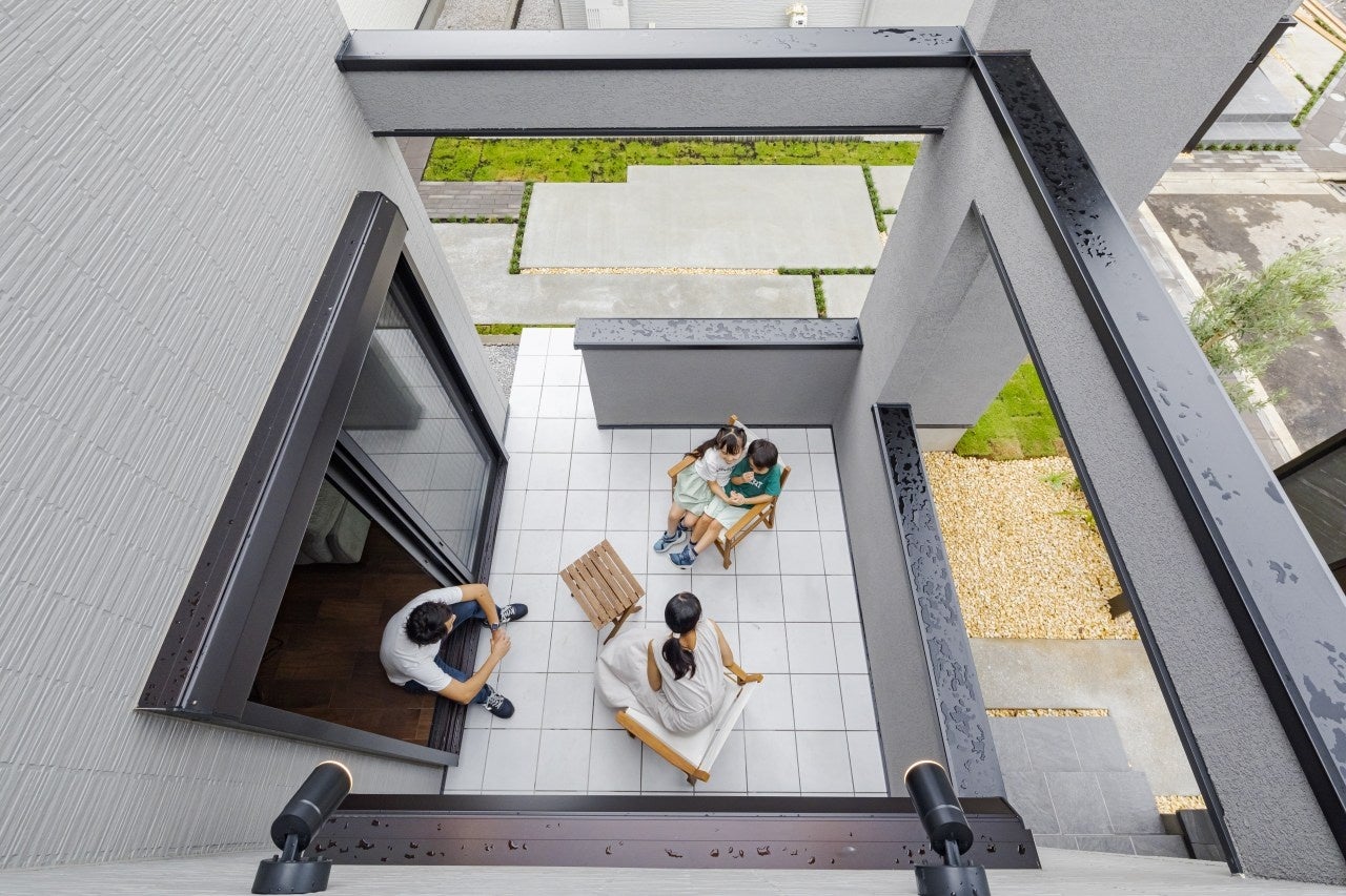 リビングに面するテラスは大屋根や壁等の建物躯体に囲まれた中に設ける事により、屋外にありつつ半屋内のようなプライベート感を兼ね備えた空間となっております。玄関、リビング、2階バルコニーと立体的に家族とも緩やかに繋がることができる空間です。