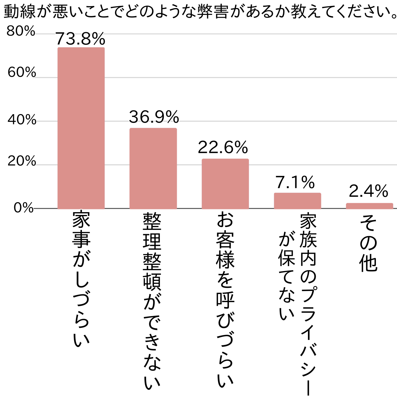 部屋の配置だけでなく、家事・生活をするスペースの狭さ、収納スペースの問題によって家事・生活動線の効率が悪化してしまうことがわかりました。これらの動線の問題により、どのような弊害が起こっているのでしょうか。アンケートで尋ねてみました。