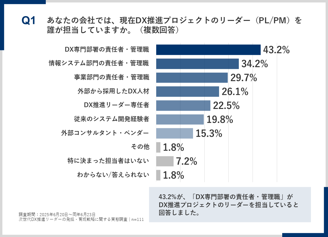 「Q1.あなたの会社では、現在DX推進プロジェクトのリーダー(PL/PM)を誰が担当していますか。」(n=111)と質問したところ、「DX専門部署の責任者・管理職」が43.2%、「情報システム部門の責任者・管理職」が34.2%、「事業部門の責任者・管理職」が29.7%という回答となりました。