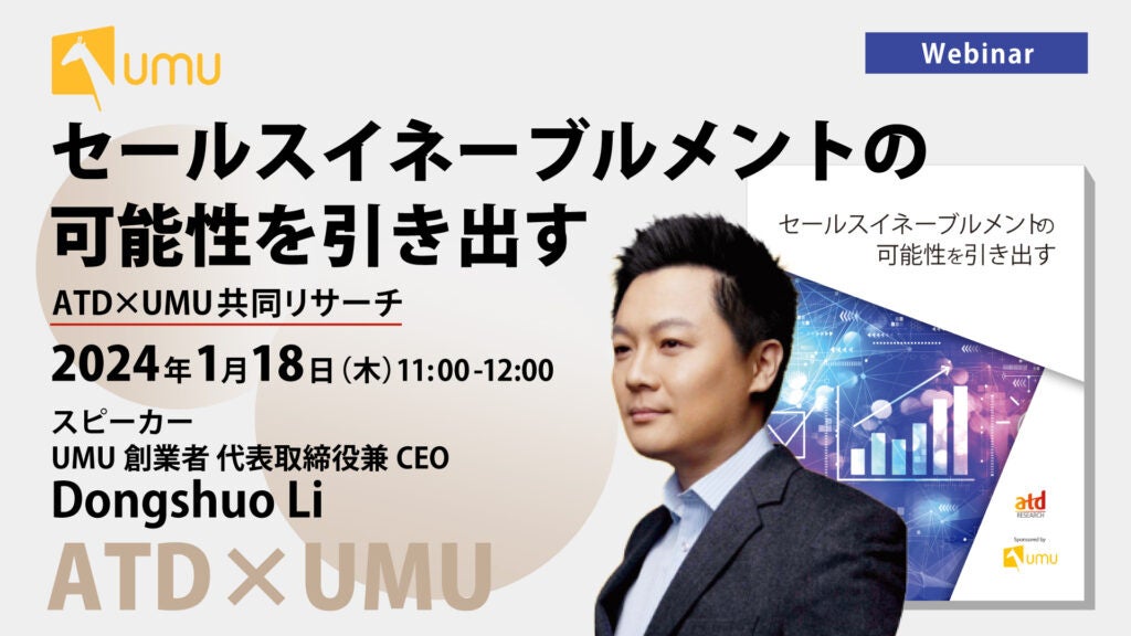 本セミナーでは、ATDとUMUが共同で実施した調査レポート「セールスイネーブルメントの可能性を引き出す」をもとに、UMU創業者、代表取締役兼CEOであるDongshuo Liより、レポート内容の発表及び、詳細な解説を行います。組織における営業力アップを目指されている企業の皆様は是非ご参加ください。