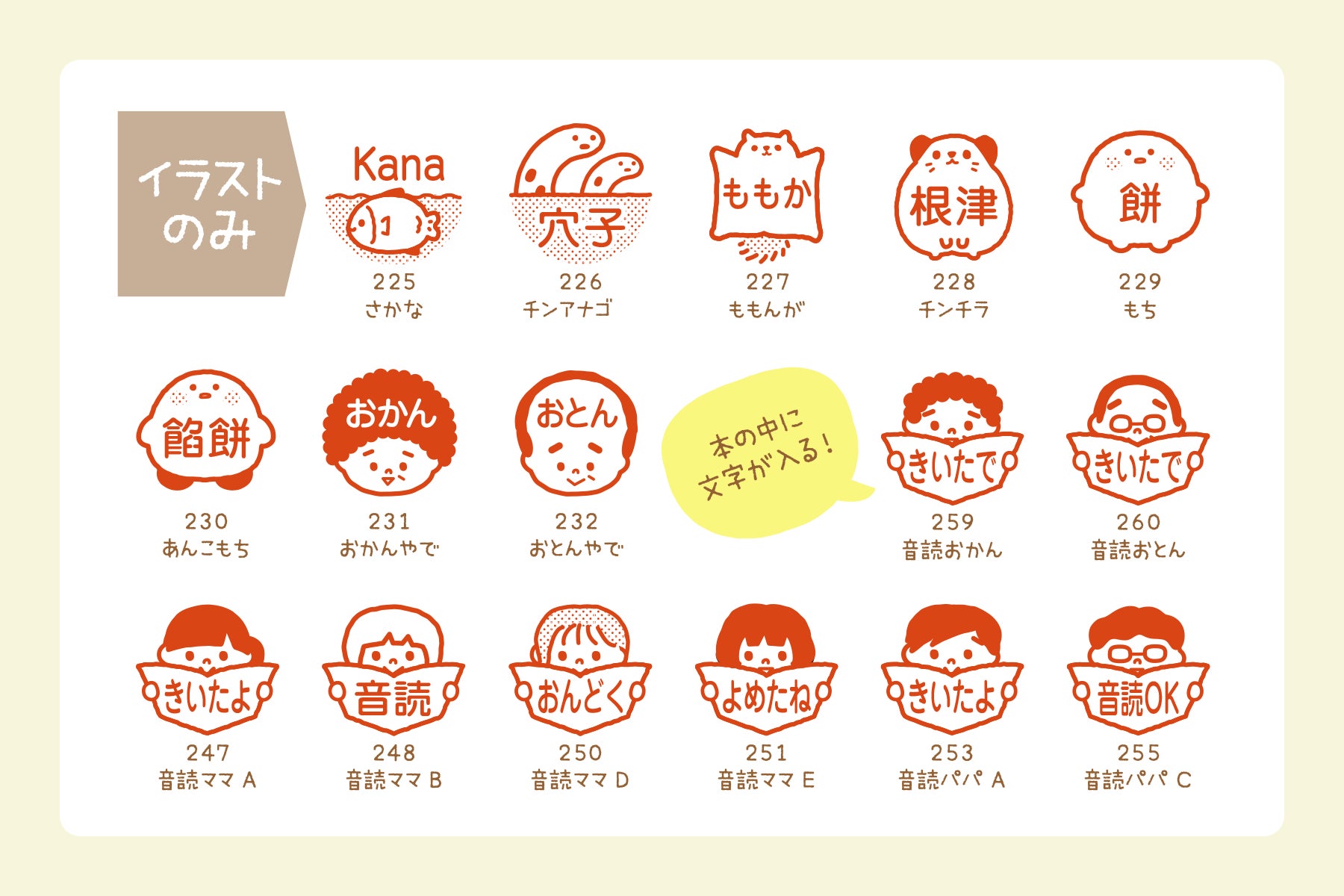 ショップで人気の、シンプルながら手描き風のかわいい「ぷちシリーズ」デザインを印鑑サイズに合わせて展開しました。すべて当店のイラストレーターが作成したオリジナルです。保護者さまをイメージした、パパママの顔が描かれたデザインも入った全296デザインです。