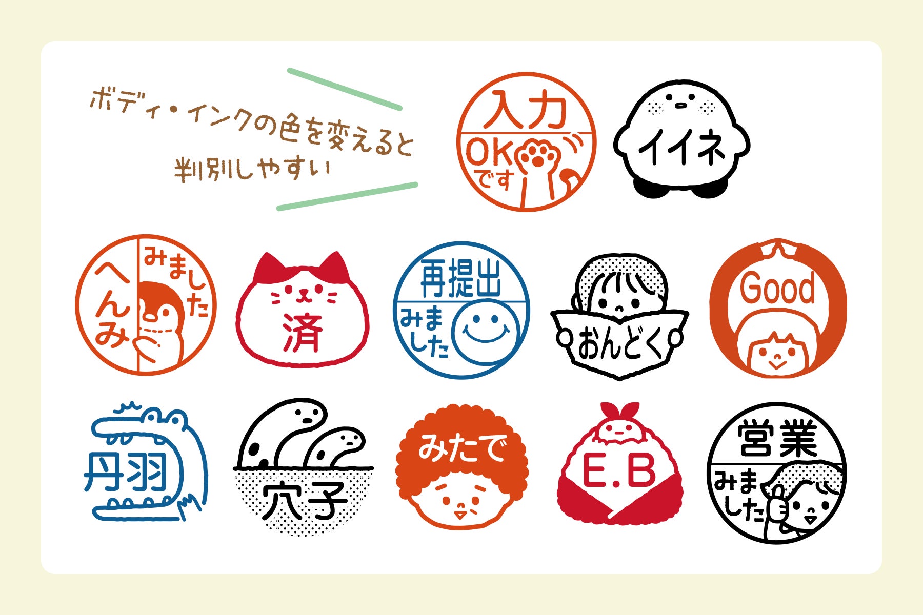 「再提出」「済」「Good」など、用途に合わせた文字を入れやすいデザインを目指しました。インクとボディカラーが選べるので、用途ごとに色分けできます。